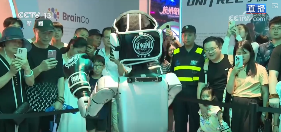 这个空间里都是2025年以来杭州科技新产品,比如“格斗机器人”,也走出擂台来到了现场,与市民游客近距离互动。