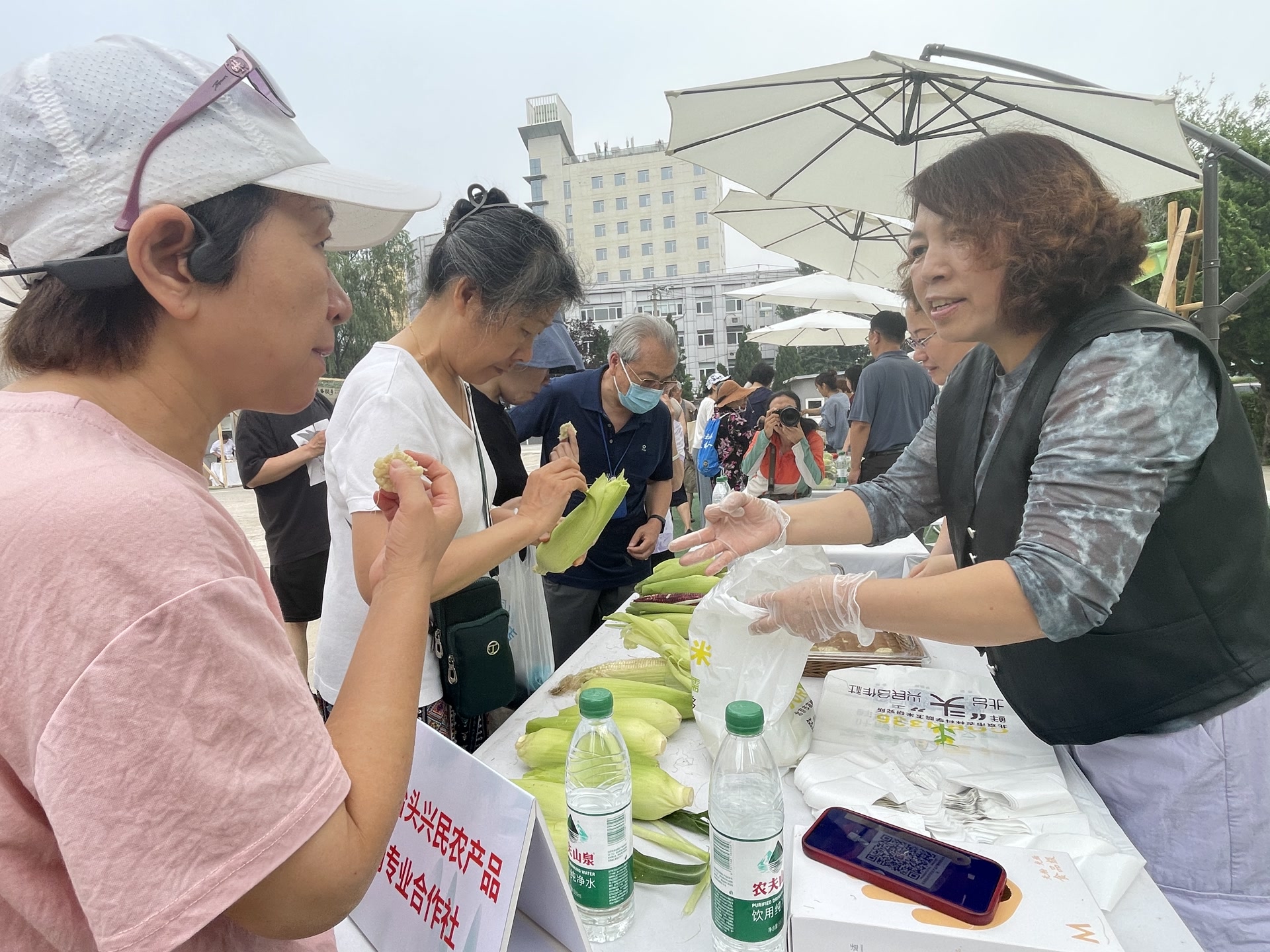 展位上摆放着早上刚采摘下来的白色甜加糯高叶酸、紫色甜加糯高花青素两种新型鲜食玉米。白色款是市面上主流的农科糯336,占北京市鲜食玉米市场的60%左右。一旁的紫色玉米闻起来有股玫瑰香,是富含花青素的新品种京紫糯519。其好似石榴红的颜色、新鲜的质感,引得很多市民上前询问。