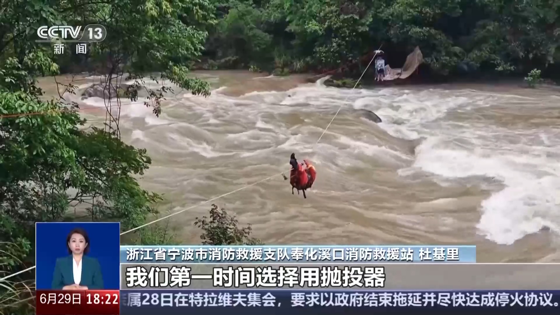 一名经验丰富的水域救援人员沿着绳索从激流上方越过,横渡抵达对岸,协助两人穿戴好救生装备,保护他们渡河。近三小时后,两人被安全救回岸边。