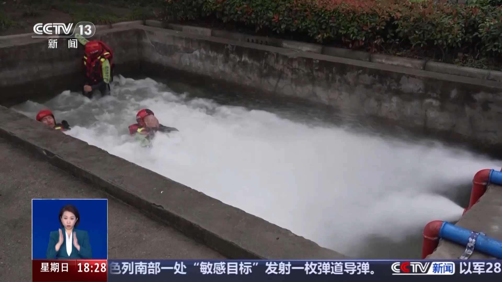 随着水流持续加大,体重70公斤的消防员也出现了重心不稳,1分钟时,被冲倒在水池中。