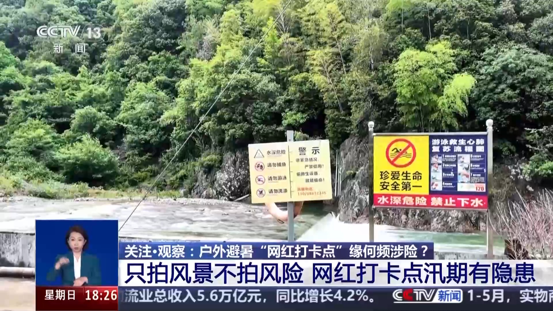 在河道边,能看到当地设立的多个警示牌写着“禁止在该河滩和周边进行烧烤、野餐、焚烧等活动”“水深危险、注意安全”,还配有救生、救援设备。