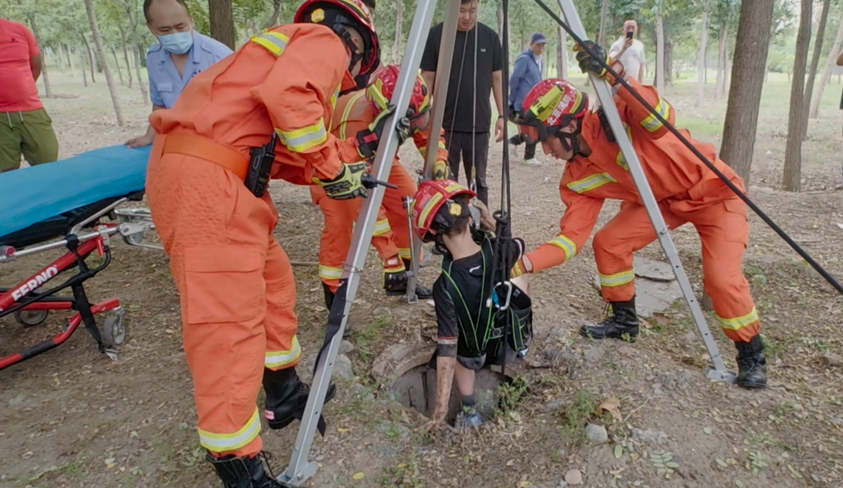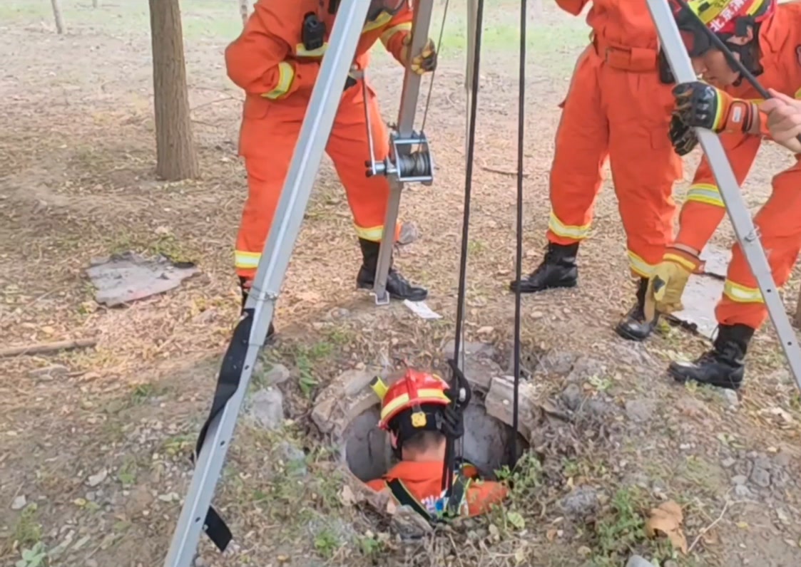 随后,消防员在井口架设救援三脚架,一名经验丰富的消防员穿戴好个人防护装备,携带救援绳索和全身安全吊带,通过救援三脚架缓缓索降下井。