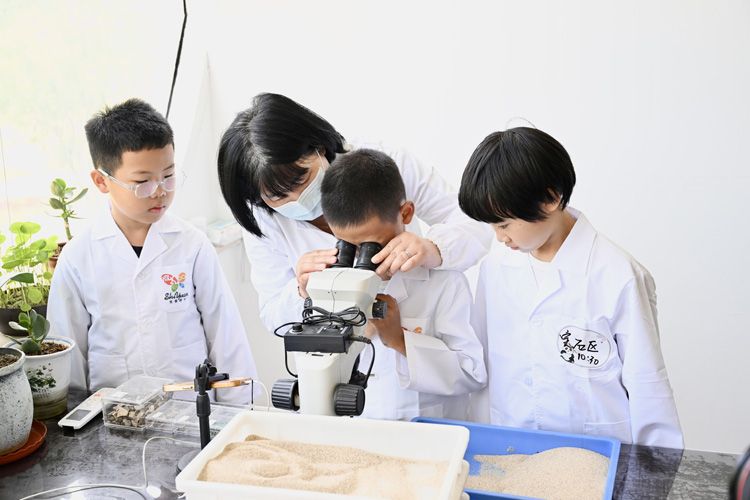 中国科学院古脊椎动物与古人类研究所技术人员指导青少年学生体验微体化石的挑样,从混杂的沉积物中分离出微体化石。