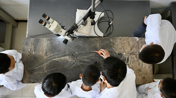 技术人员指导青少年学生学习修复脊椎动物化石。