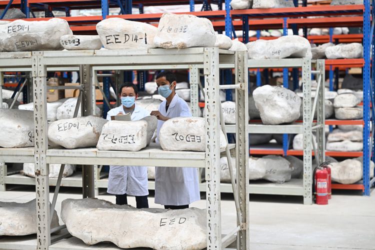 中国科学院古脊椎动物与古人类研究所科考人员入库整理野外采集的脊椎动物化石标本。