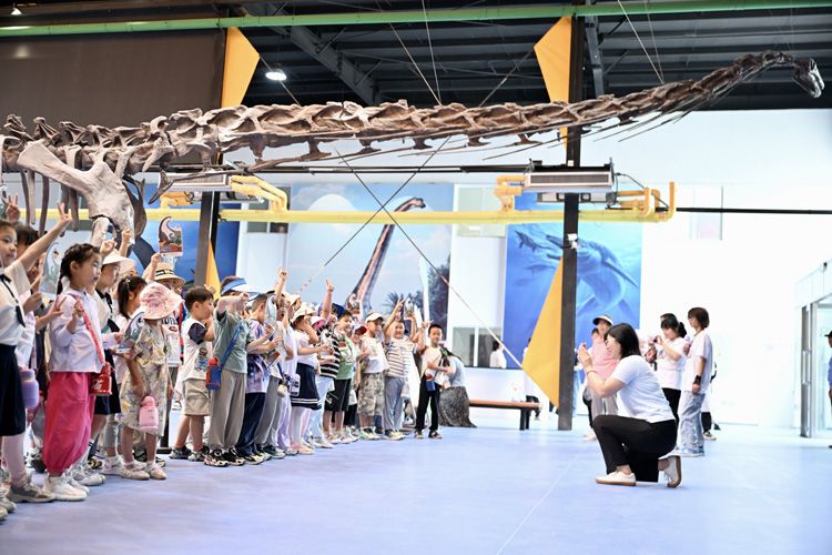 世园古生物研学基地坐落于北京世园国际旅游度假区百蔬园东侧,总占地面积2962平方米,分为上下两层展区。展区内陈列的亚洲最完整的合川马门溪龙骨架(体长24米)及15项国际顶级学术期刊《自然》《科学》封面成果的部分化石模型,成为吸引青少年的“明星展品”。