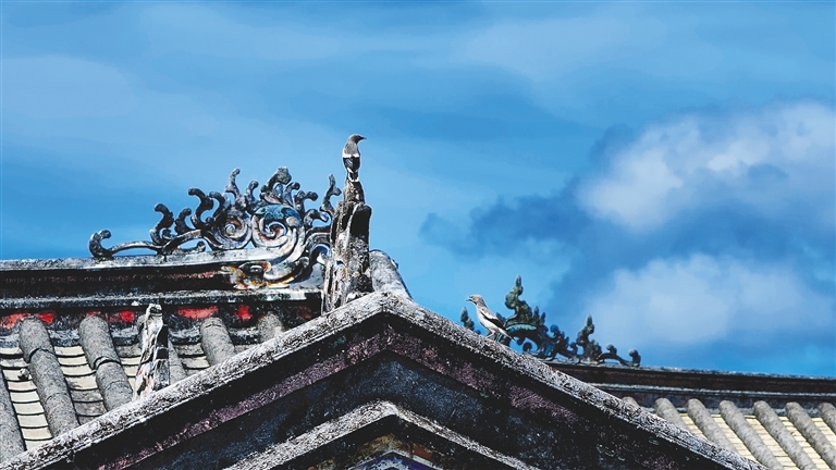 村中最古老、最具代表性的建筑当属“九牧堂”。推开厚重的黑檀木门板,时光的气息扑面而来。房梁屋脊上精美的雕龙画凤木刻虽已蒙尘,但依稀可见往昔风采,梁架木构件、公阁等处的雕刻细节,无声诉说着昔日工匠的精湛技艺。抬头仰望,正厅高悬的“九牧堂”匾额,承载着家族的荣光与传统。“祖上林披在唐朝时,九个儿子都当了州官(州牧),门庭显赫。”村民林方汇仰望着匾额说,“明代先祖从福建莆田迁来时,就把这堂号带到了海南。”