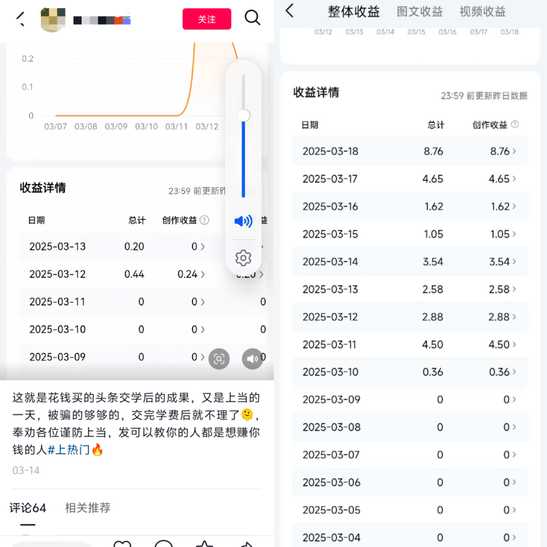 即使一些用户侥幸实现变现,往往每日收益也仅几元或几十元,与宣传的“月入过万”相差甚远,而那些被用作宣传的诱人收益案例,则无法验证其真实性。实际上,许多报名类似课程的学员在网上晒出的入账记录显示,尽管他们投入大量时间和精力,最终收益却少得可怜。