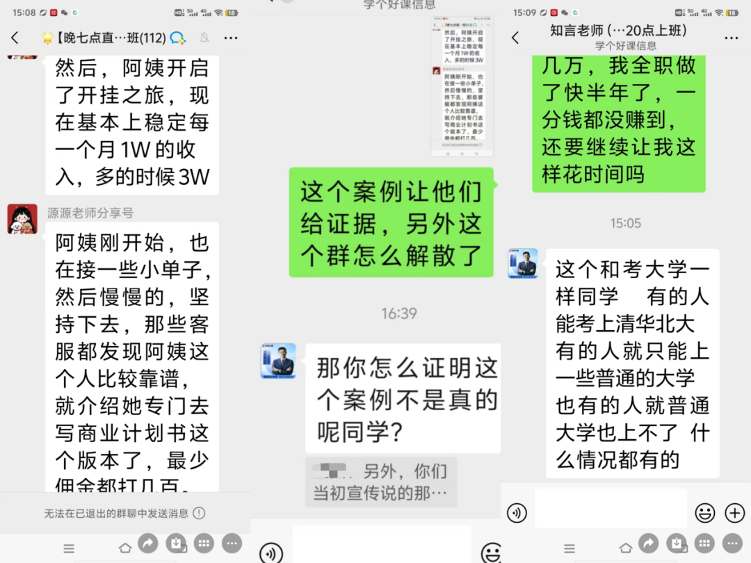 贾玫还发现,微信群中大多数付费报名的也是老年人。而当她事后因为没有任何收益醒悟,要求机构老师提供宣传案例中“有人月入3万”的证据时,对方却反问:“你怎么证明这个案例不是真的呢?”