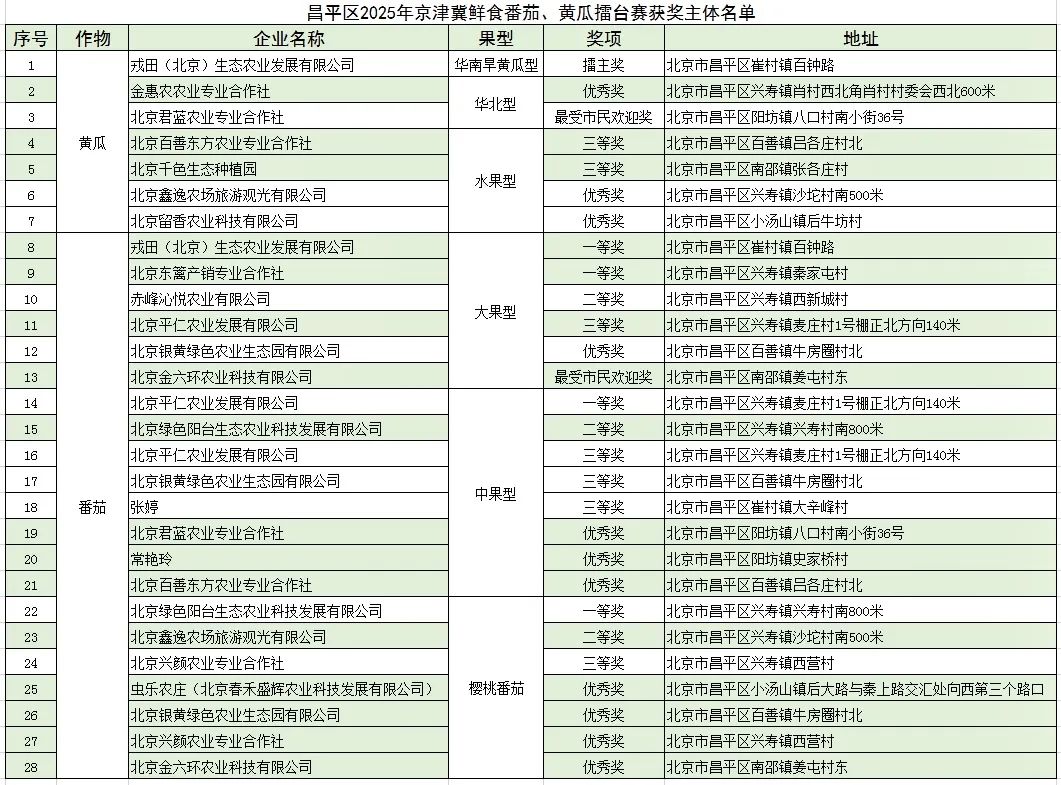 近日,区农业技术推广站组织昌平区蔬菜种植主体参加以“种业创新 兴业富民”为主题的“2025京津冀鲜食番茄黄瓜擂台赛”,来自北京、天津、河北三地近150家参展单位的338个番茄、黄瓜样品同场竞技,昌平区17个种植主体斩获多项殊荣。