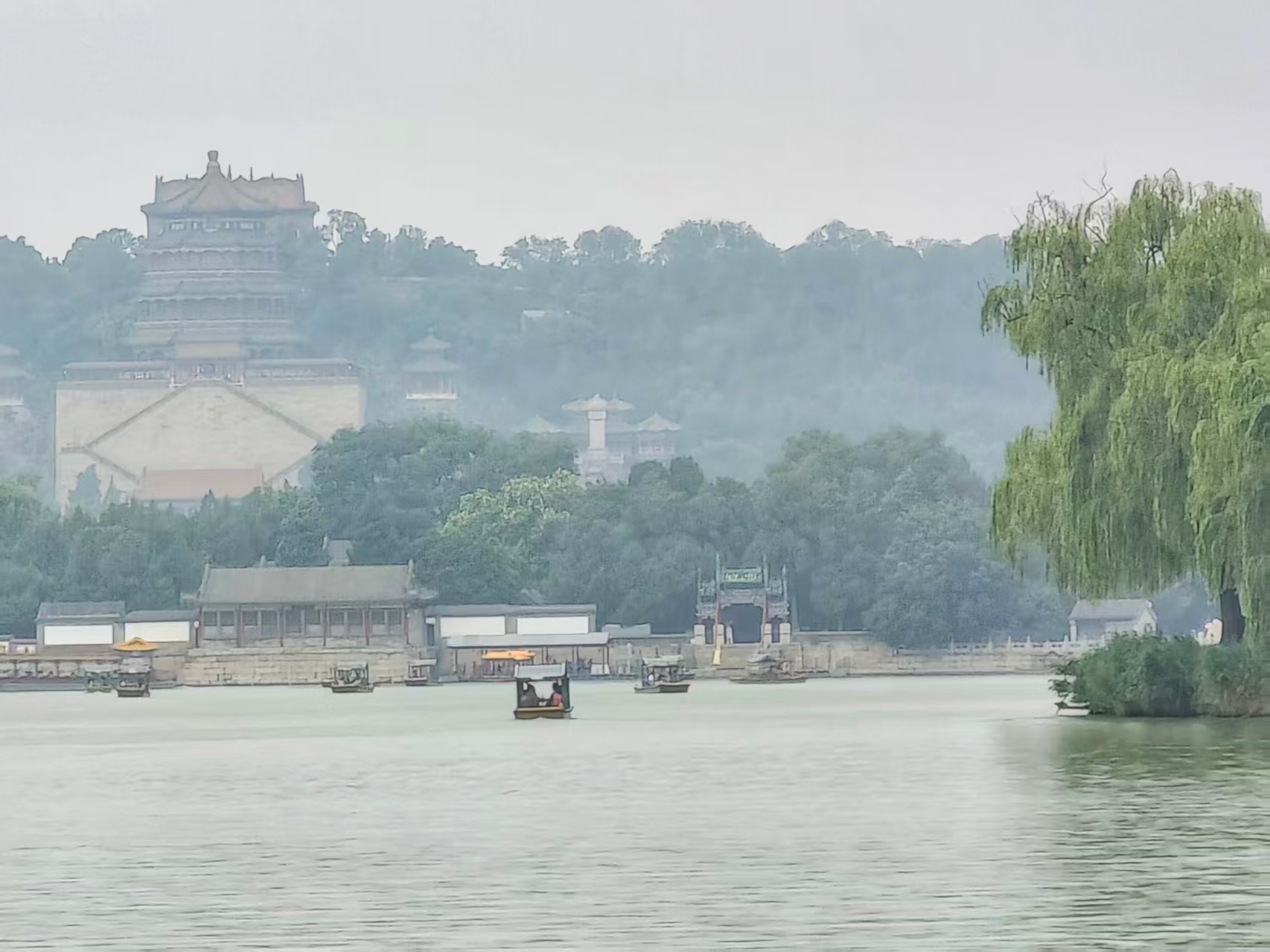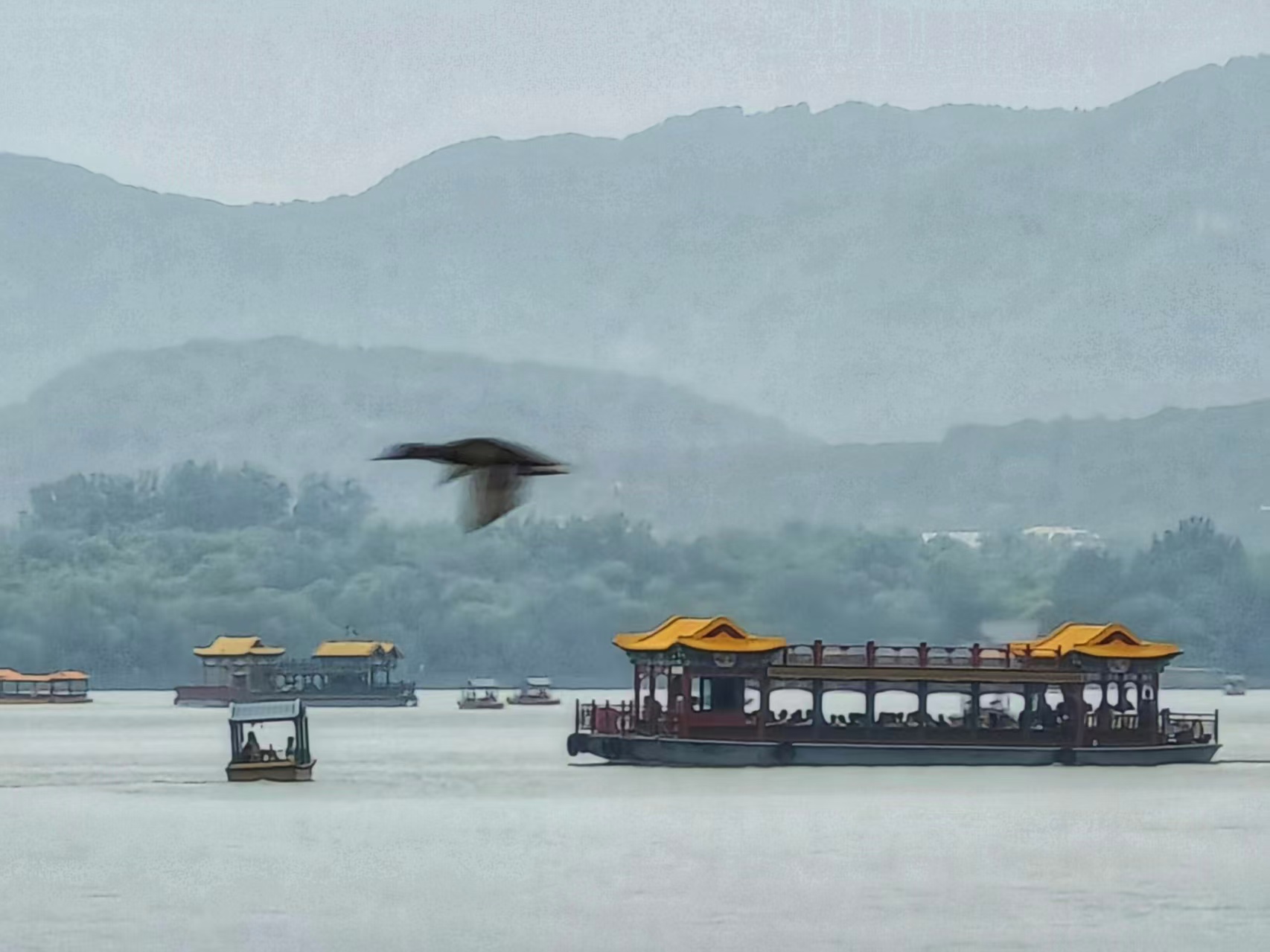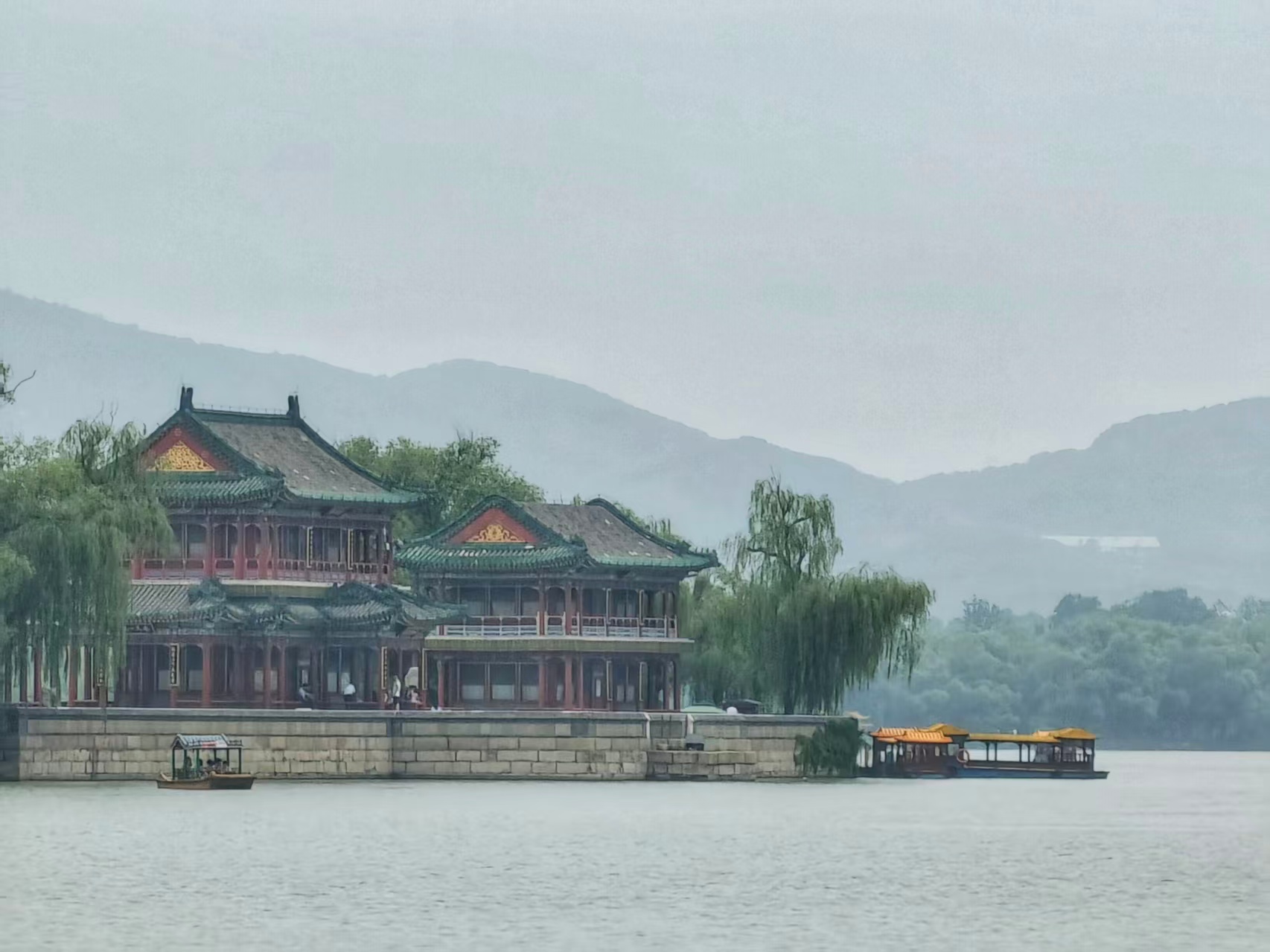 蒙蒙细雨织就颐和园的素绢,昆明湖晕染开青灰墨韵;游船如繁星点点,水墨颐和园,胜似烟雨江南。