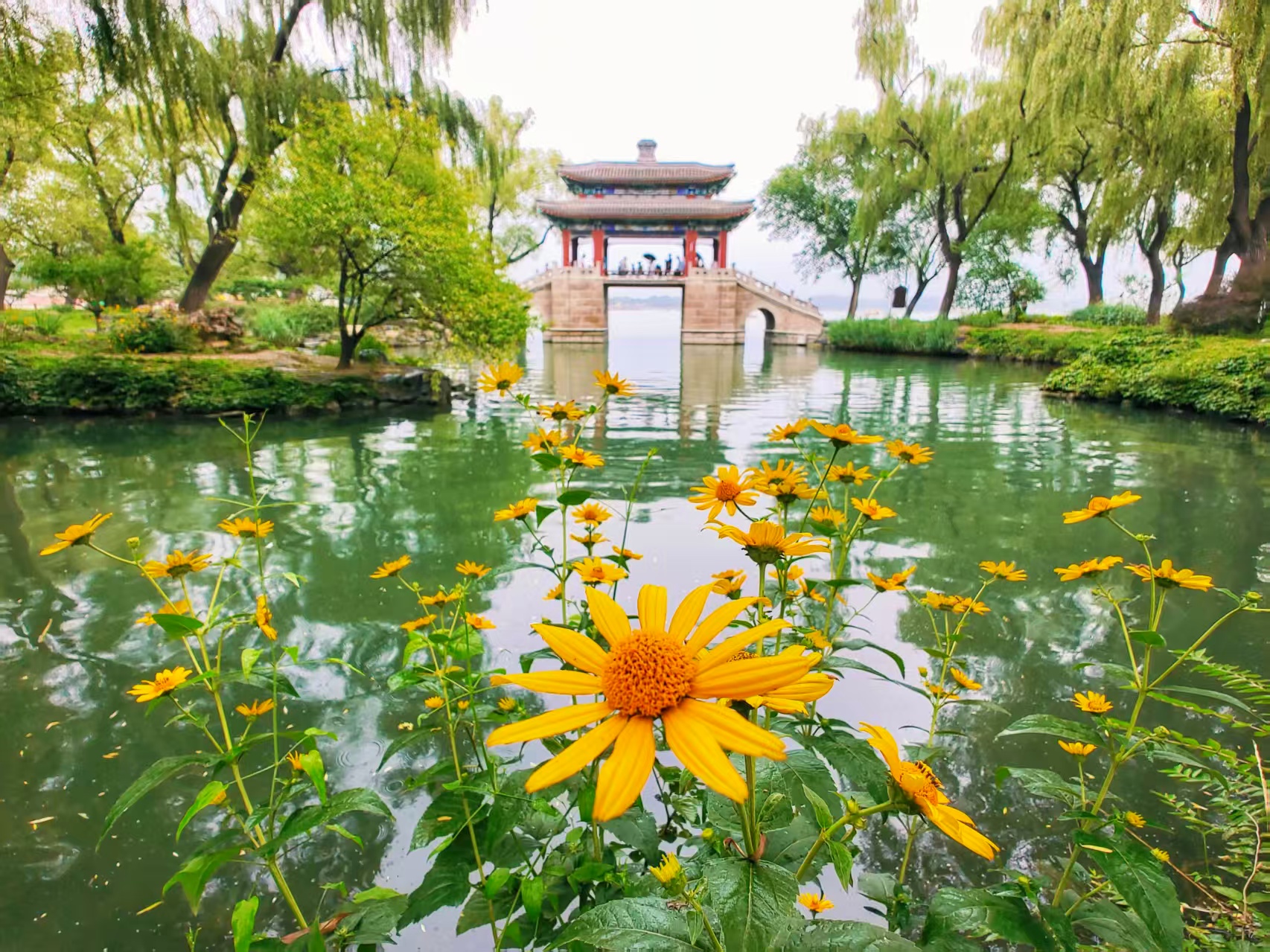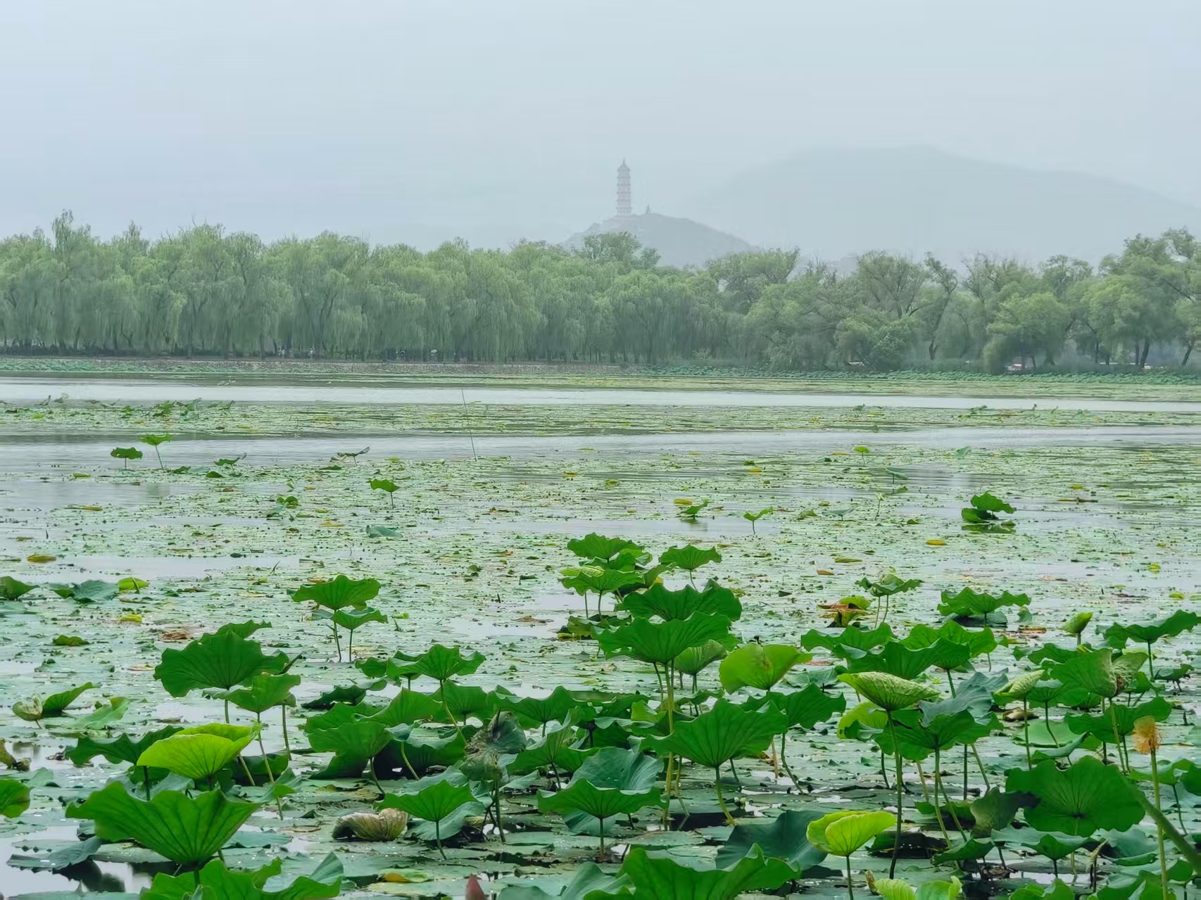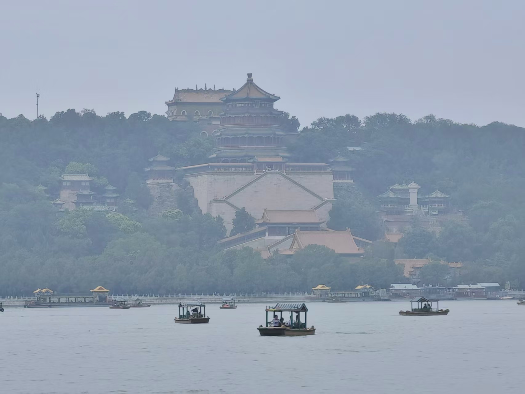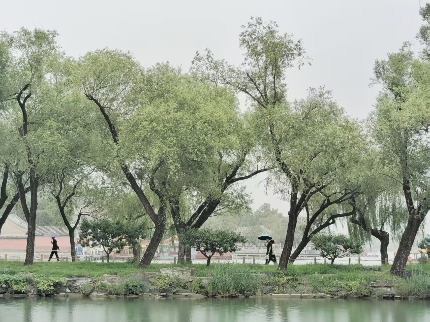 蒙蒙细雨织就颐和园的素绢,昆明湖晕染开青灰墨韵;游船如繁星点点,水墨颐和园,胜似烟雨江南。