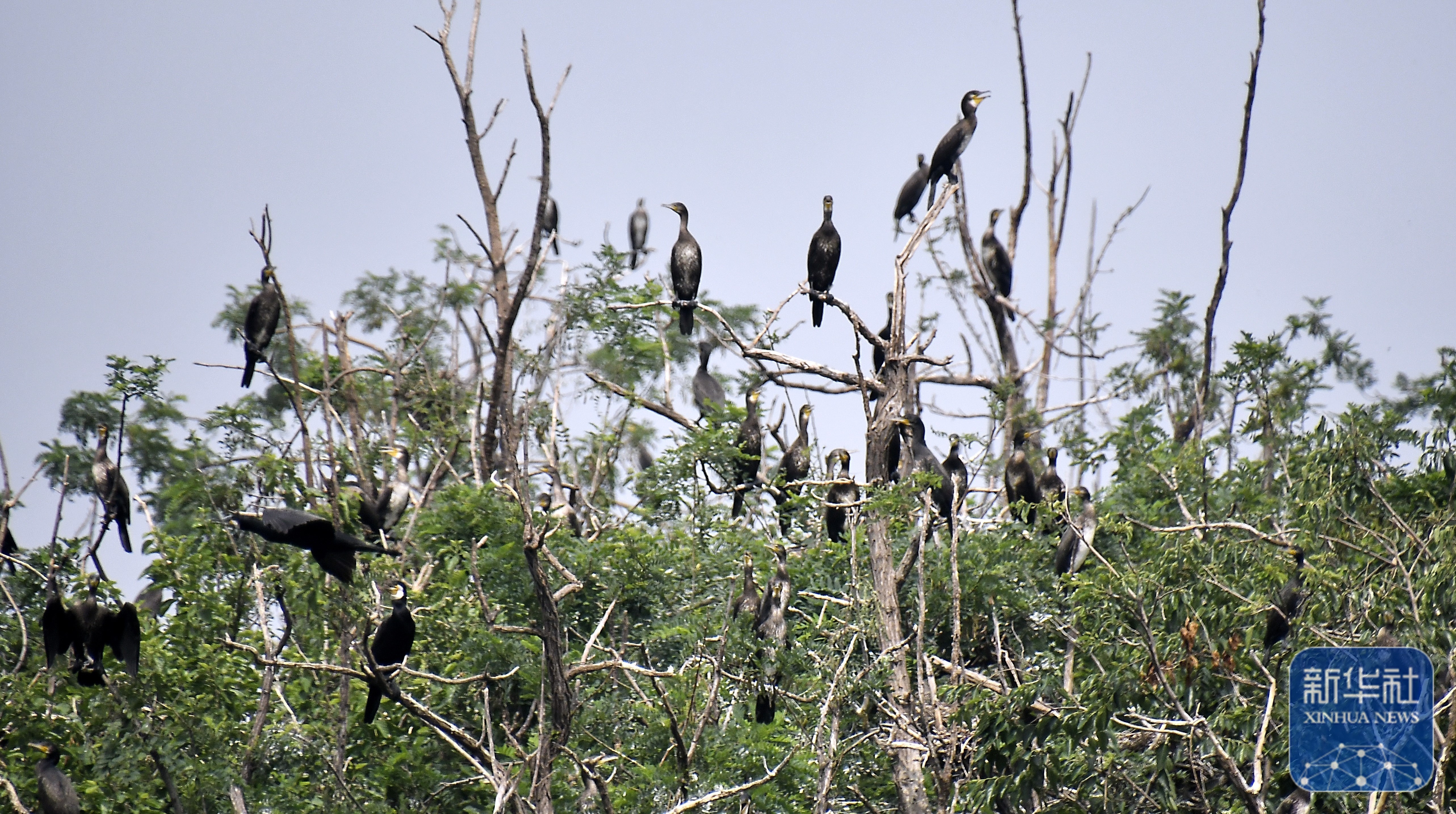 ↑ 7月2日,在密云水库鸟岛上,小鸬鹚学习飞翔。