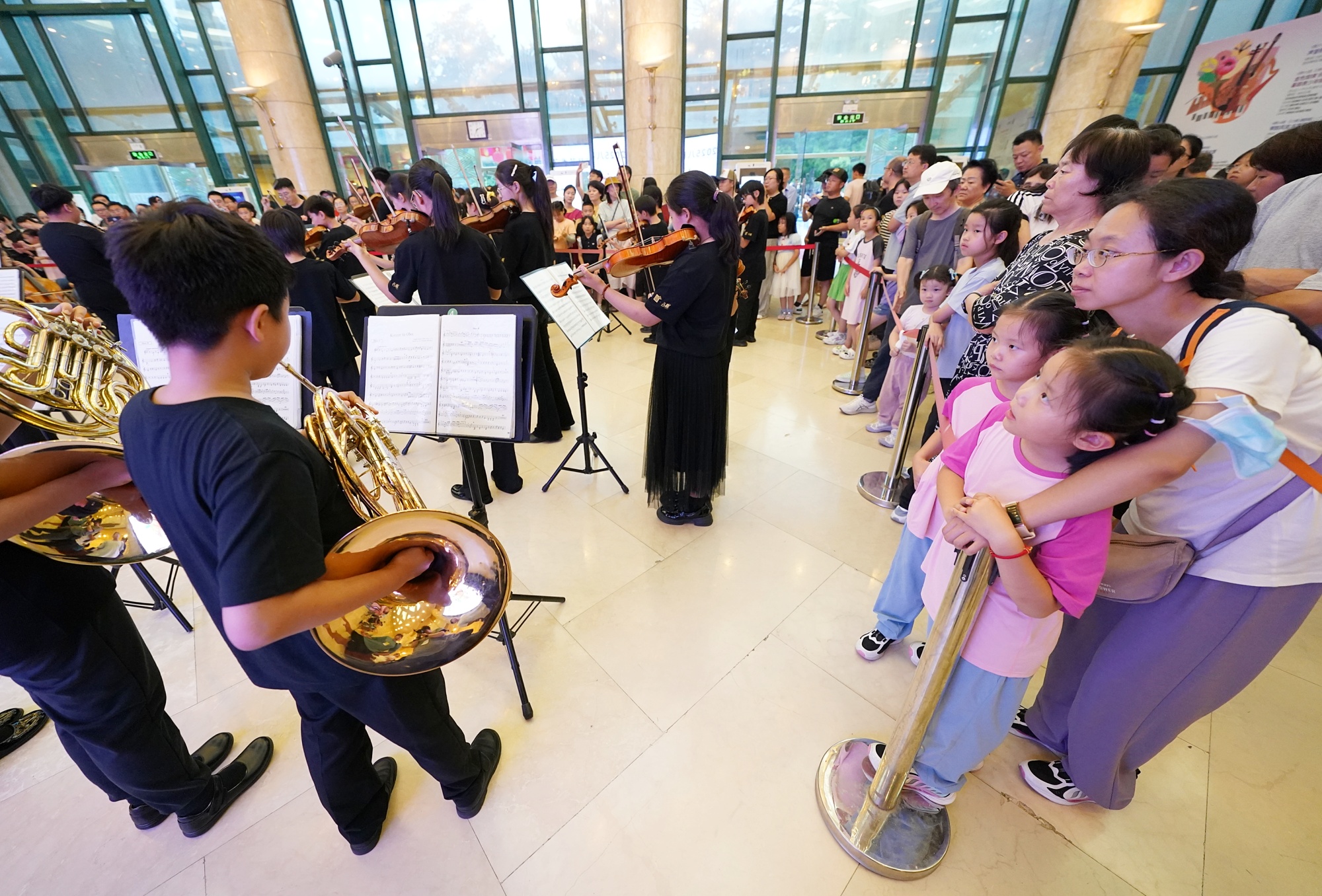 “打开艺术之门”是北京最知名的暑期艺术节品牌之一,今年已是第32届。很多艺术节的老朋友知道,每年开幕式演出前,音乐堂前厅都有特别策划的快闪演出。今年,率先迎接大小观众的是北京交响乐团附属少年交响乐团的“小演奏家”们,他们青春洋溢地演奏出维瓦尔第《四季》中的《春》《夏》等乐曲。早早来到剧场的小观众,看到和自己身量一样高的小伙伴已熟练演奏乐器,眼神里充满羡慕和敬佩。