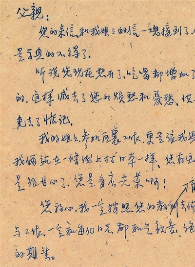 爹!您耐心的(地)等着吧!胜利的日子就快来了,今年就可以打败德国,明年就要反攻日本,那时候才是咱们团圆的时候!您不信,我姐姐会告诉您现在形势是多么有利。