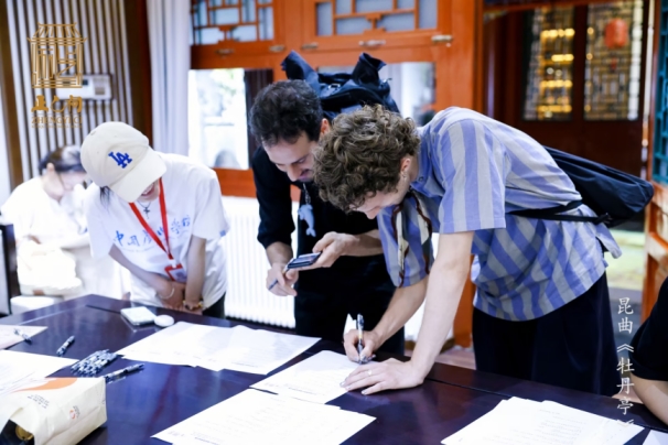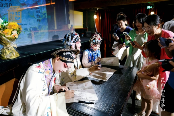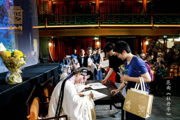 戏台之下,古戏楼中的雅韵余音同样令人惊艳。正乙祠戏楼负责人刘礼霞介绍,本场演出与以往不同,增设了不少亮点环节。演出结束后,三名主演身着戏服、摆开案几,在精心设计排版的剧情简介页上签名,与现场的戏迷朋友近距离互动。“我们还提前准备了调查问卷,希望倾听到戏迷朋友们的真实心声,以便于后续为大家带来更好的观戏体验。”