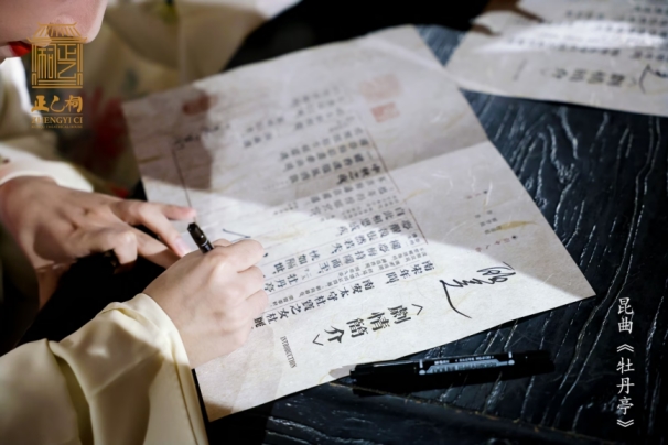 此外,在现场为纪念票准备的盖章区,不同姿态的小猫“墨纹”印章也是戏楼为广大戏迷准备的“彩蛋”之一。据悉,因与财神赵公明的渊源,正乙祠便将戏楼内的小黑猫取名为与赵公明坐骑同名的“墨纹”。除此以外,戏楼还为本场演出精心准备了以《牡丹亭》为主题的定制糕点,让戏迷朋友们在观看精彩演出之余,也能品尝到精致的糕点。