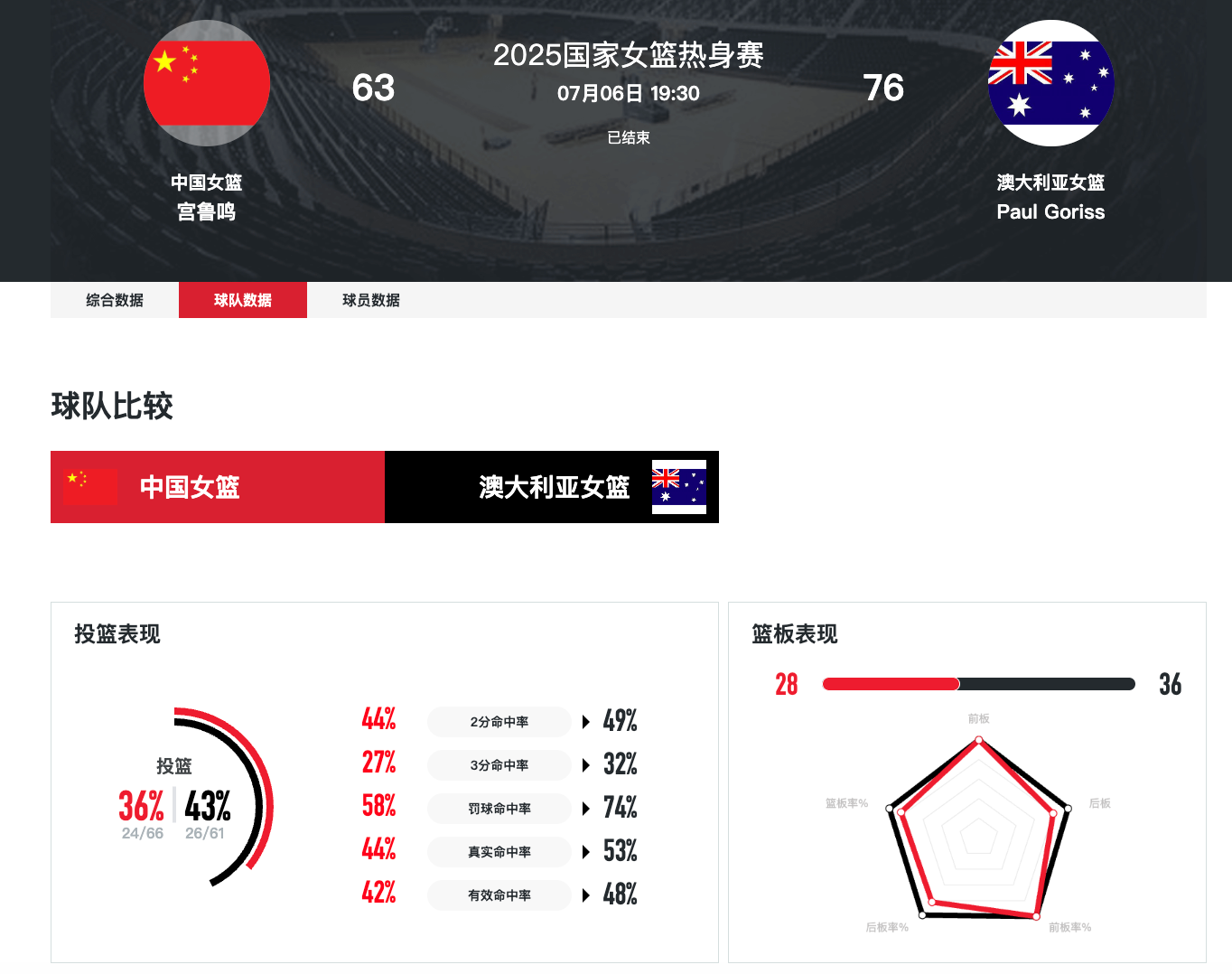本场比赛中,澳大利亚队对中国女篮的传导球持续施压,内线防守也十分到位。中国女篮则以练兵为主,尝试了多套阵容组合。尽管上半场一度落后对手18分,但在末节最后阶段打出一波进攻高潮,将分差缩小至7分。不过最后还是以63比76不敌澳大利亚女篮。此役,韩旭砍下全队最高的15分、9篮板,杨力维得到10分,罗欣棫得到9分。