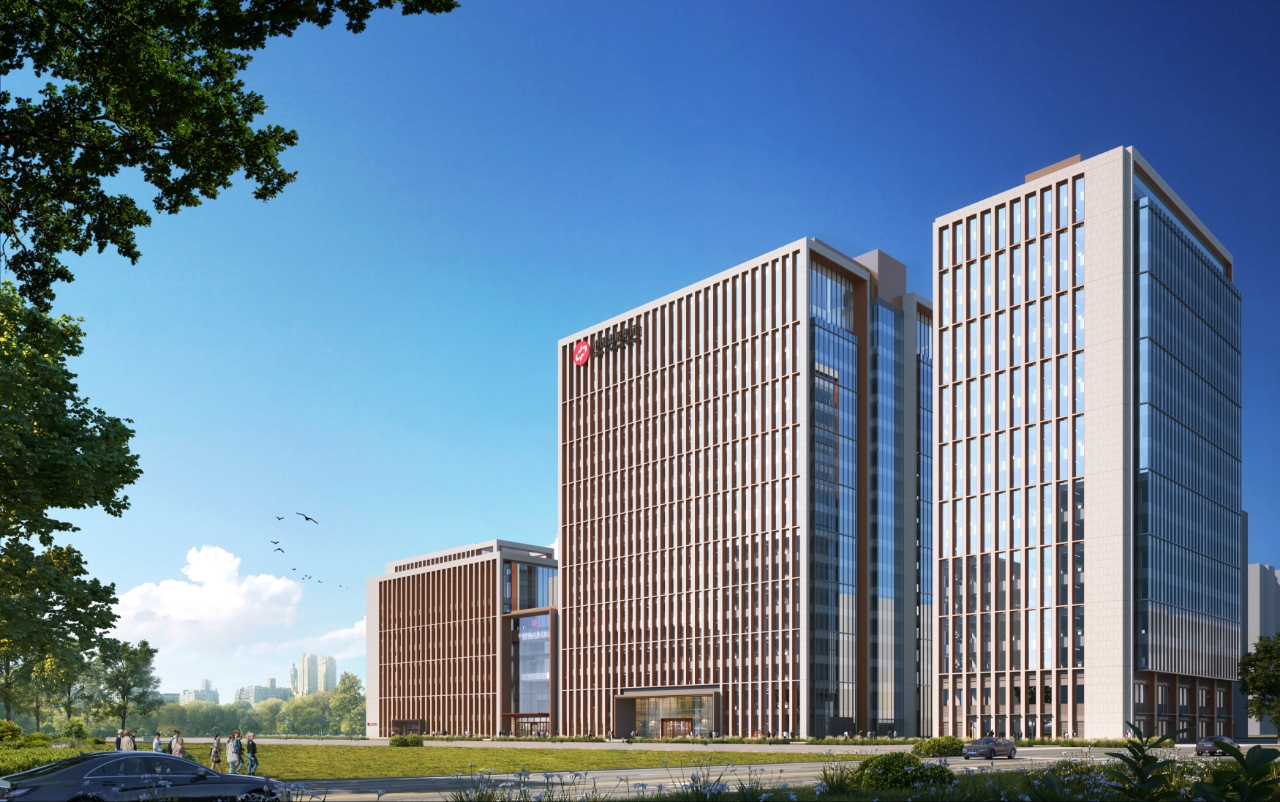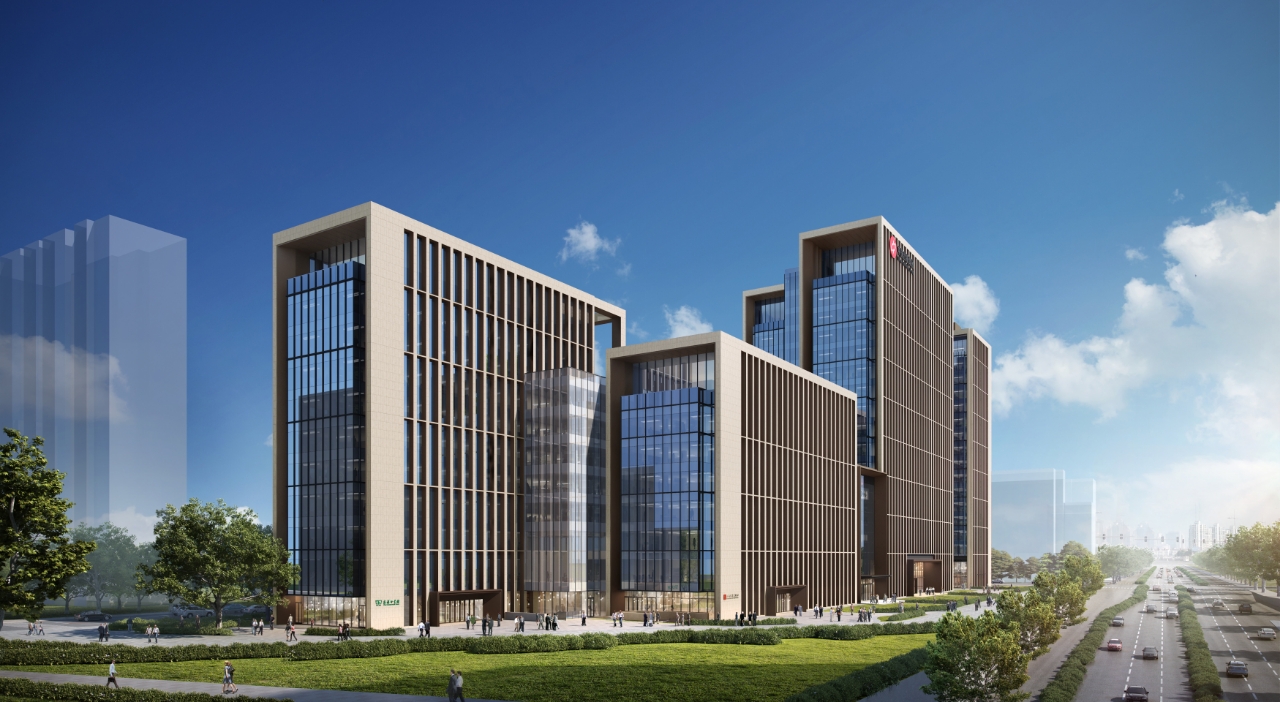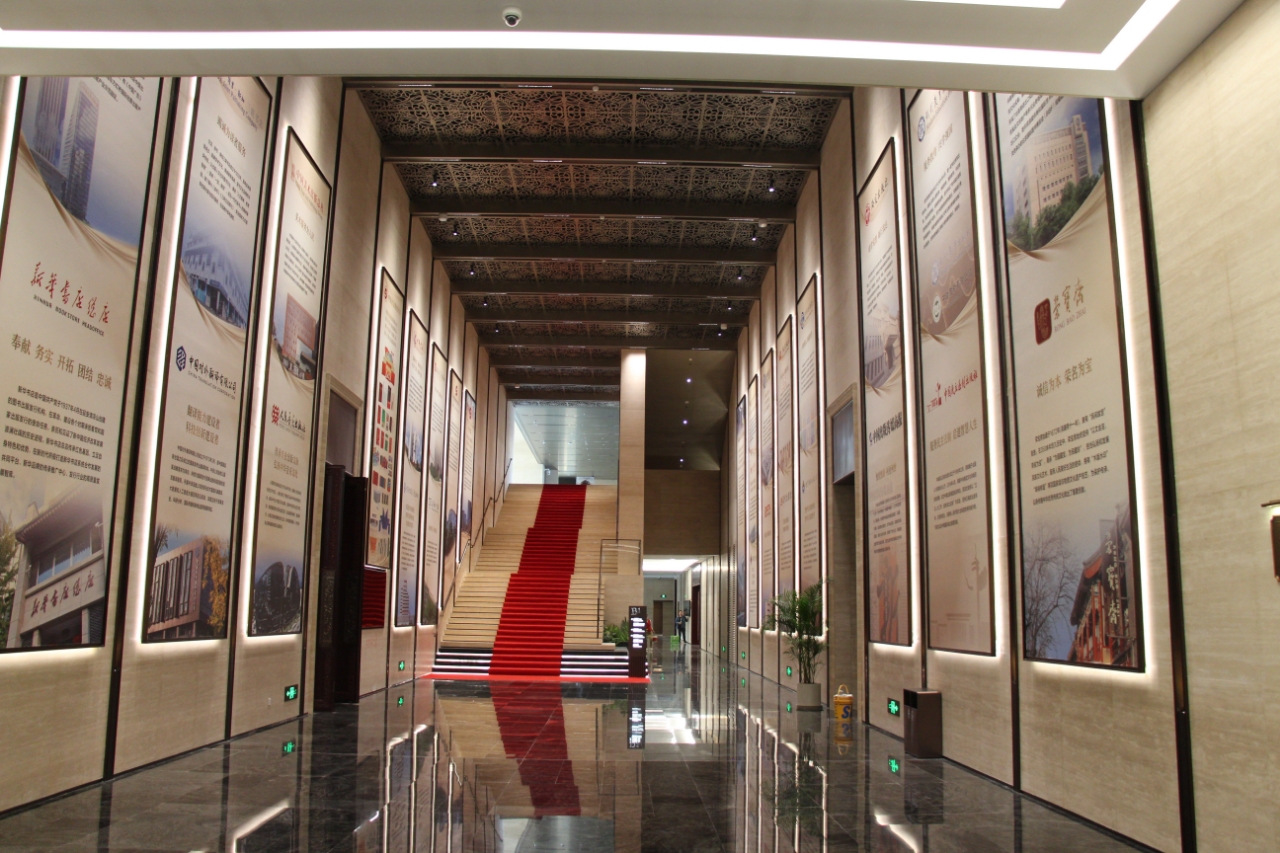 从高空俯瞰,建筑群以均衡对称的方正布局呼应“中”字之形,仿佛一枚印章稳稳落于城南。从地面远眺,建筑以“金书玉匣”为设计概念,如同《四库全书》,典籍层叠而立,外观大气,文化氛围浓厚。