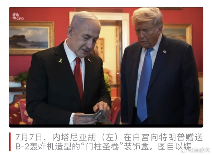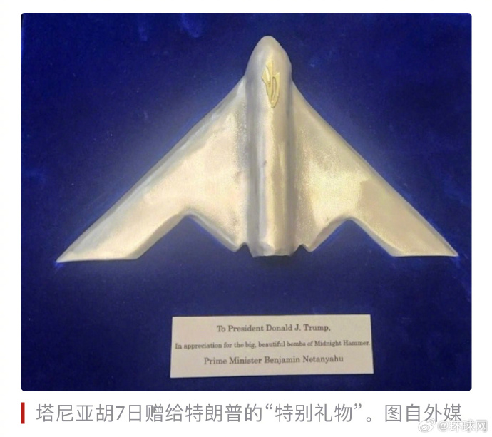 以色列总理内塔尼亚胡本周抵达美国访问。据《以色列时报》等媒体当地时间9日报道,内塔尼亚胡7日在白宫向美国总统特朗普赠送了一份“特别礼物”——美军B-2轰炸机造型的“门柱圣卷(mezuzah)”装饰盒,以此“纪念曾空袭伊朗关键核设施的美军战机”。这件礼物在社交平台上引发争议,有网友批评说,这“并不是外交,而是对暴力的荒诞致敬”