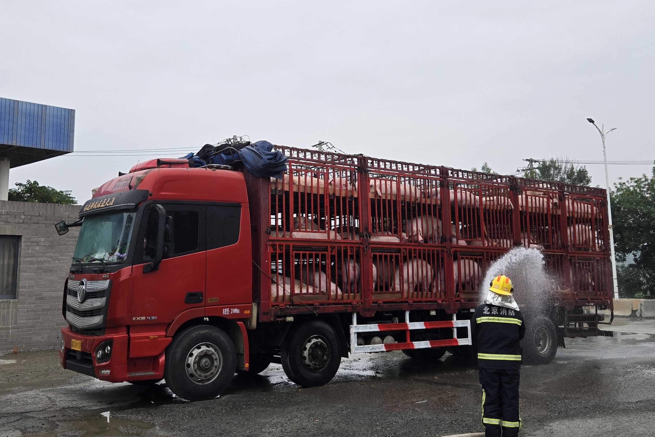 清晨5时47分,密云区古北口消防救援站的警铃响起。一名货车司机在古北口镇北甸子综合检查站焦急求助:“车上的猪热得不行了,需要洒水降温!”司机描述,满车生猪已蔫头耷脑,情况紧急。