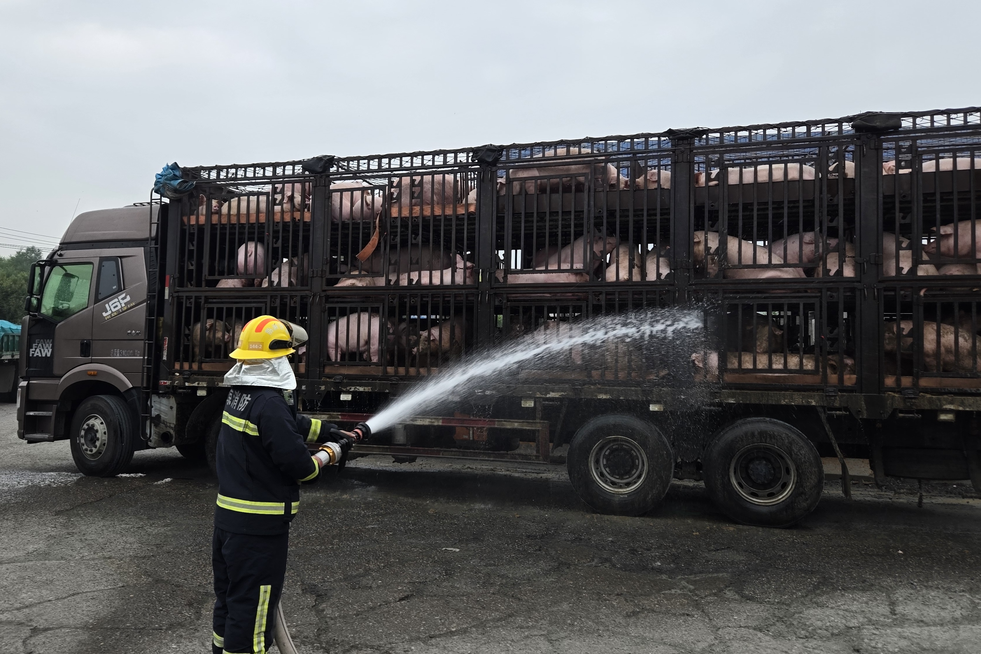 消防队员迅速实施警戒,铺设水带,将水枪调至开花模式。清凉的水流喷向车厢,为猪群全方位冲澡降温。