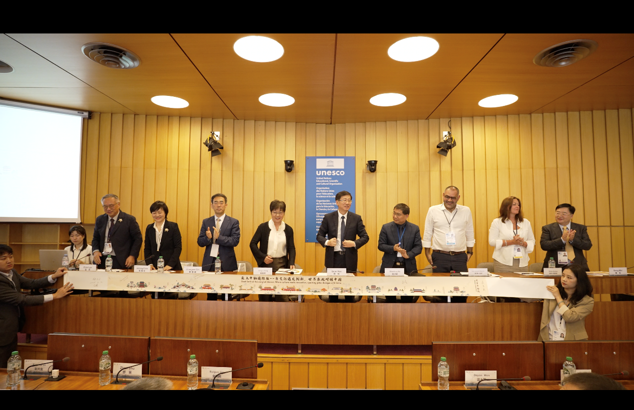 7月12日,第47届世界遗产大会期间,在法国巴黎联合国教科文组织总部,“数字技术服务世界遗产可持续发展”边会暨北京中轴线论坛举办。