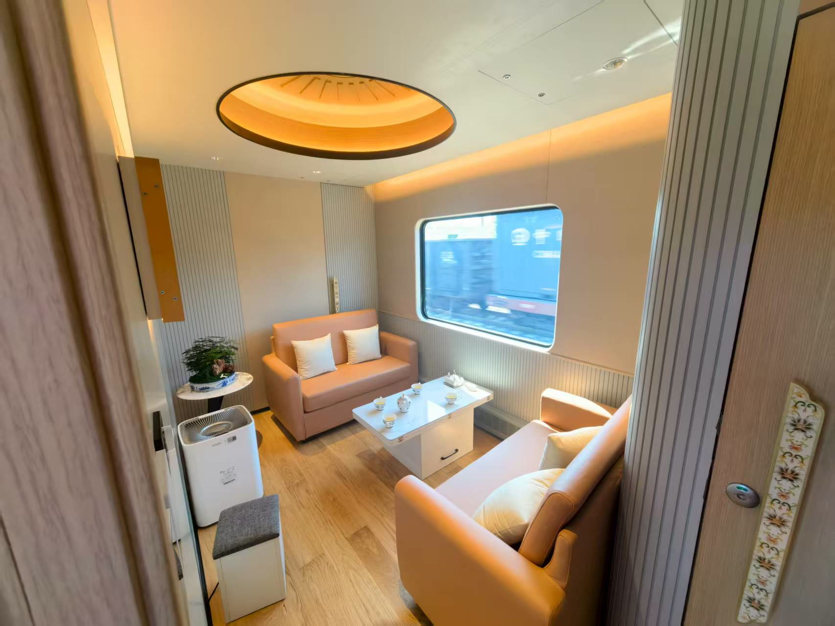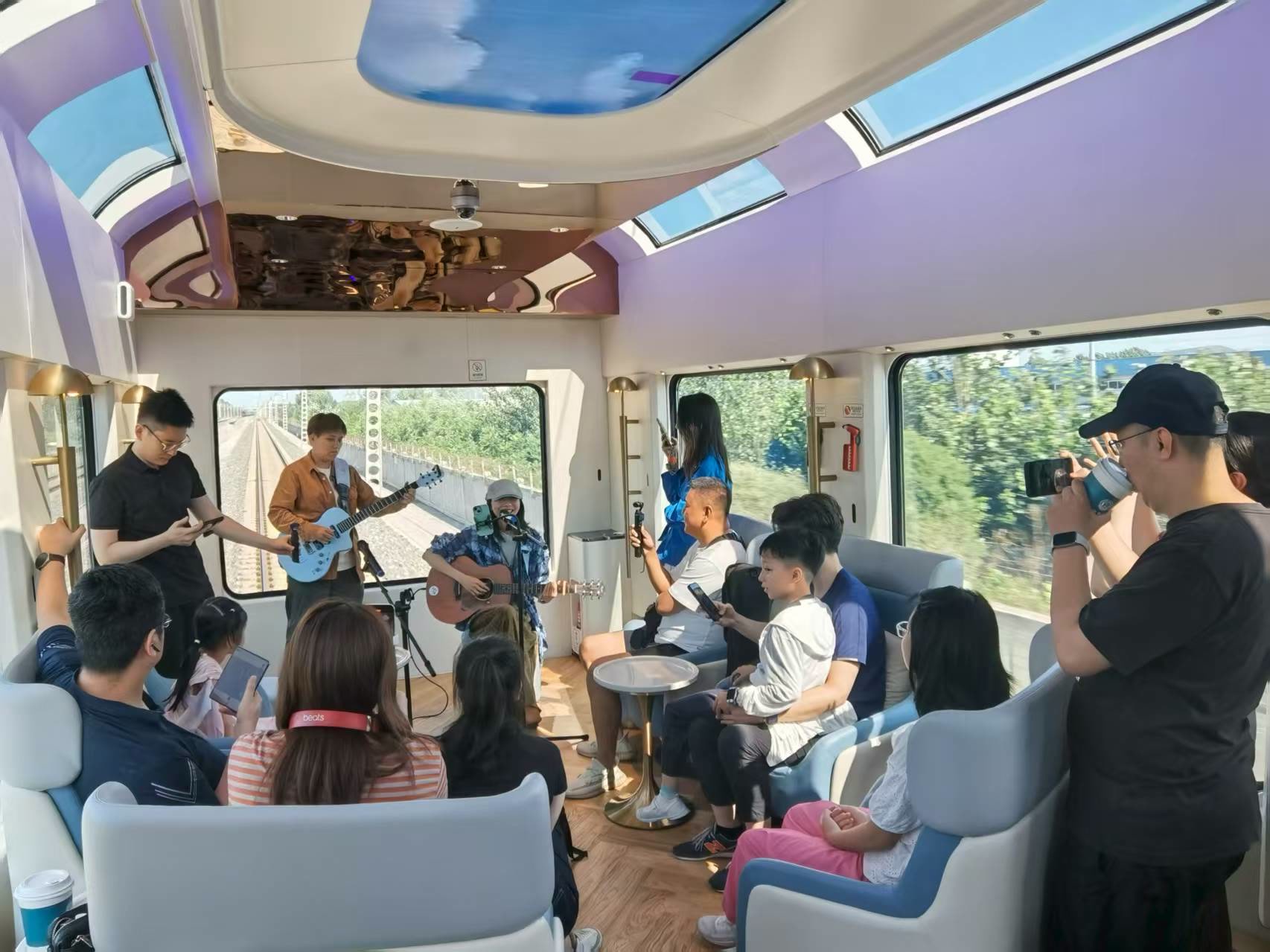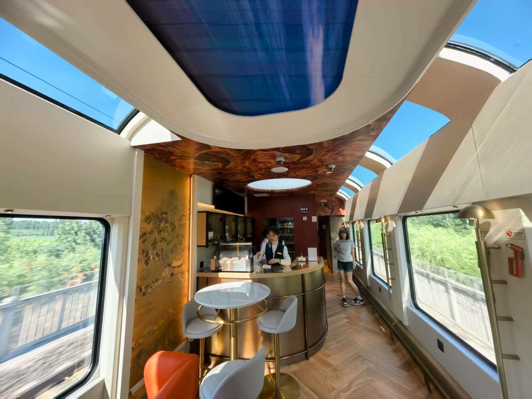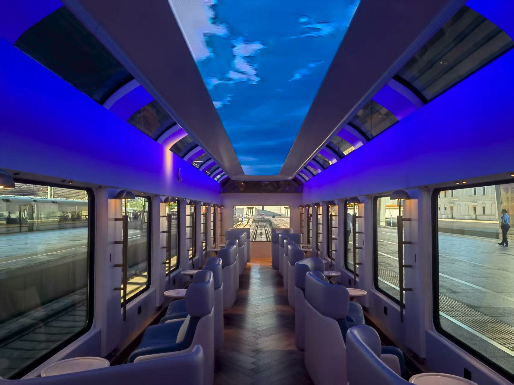 全景观光车厢是整趟列车的 “宝藏车厢”。超大观景窗、侧顶天窗与顶部LED天幕无缝衔接,让人仿佛置身于一个透明的观景台。当列车行驶在华北平原,广袤的田野一望无际,绿意盎然;靠近秦皇岛时,渤海湾的壮阔景色逐渐映入眼帘,波光粼粼的海面在阳光的照耀下闪烁着金色的光芒,海天一色的美景让人不禁发出阵阵惊叹。在这里,无论是拍照打卡,还是静静欣赏风景,都能收获满满的快乐。