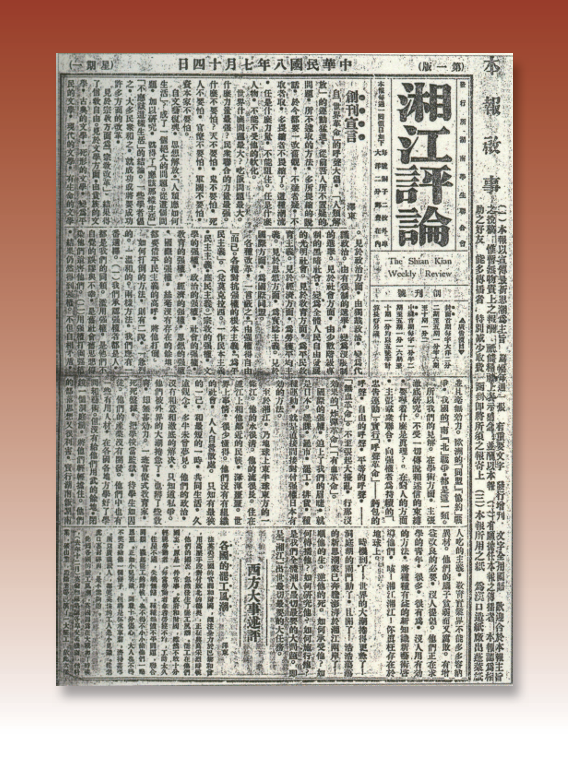1919年7月14日,毛泽东主编的湖南省学联刊物《湘江评论》在长沙创刊,它“以宣传最新思潮为宗旨”。毛泽东为创刊号撰写创刊宣言及长短文20余篇,对帝国主义和封建势力进行揭露和抨击。