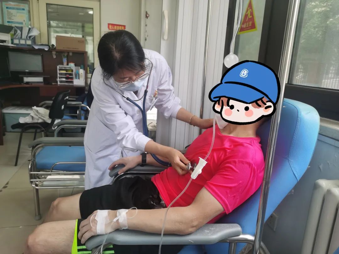 待阿元情况稍趋稳定,医护人员将其搀扶引领至新村中心急救室,为其进行静脉点滴补液,同时擦拭处理伤口,并建议阿元日后在运动前进行健康评估。期间,医护人员提议联系家属来院照护,阿元动情地表示:“各位医护人员就是我的家属,你们在我就踏实了,不用联系我的家人。”