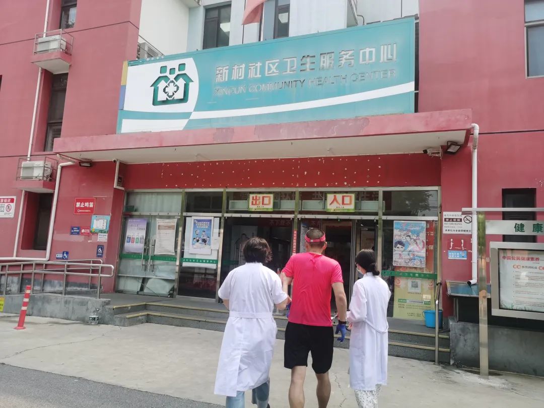 7月12日,天气异常闷热,两名热心路人前往新村社区卫生服务中心紧急求助,称路边有一名跑者晕倒了,请医生去紧急救治。需求就是命令,中心党支部书记、主任林庆立刻带领副主任敬燕燕、全科医生王学静和护士长乔玉竹组成临时急救小组,迅速赶到现场开展紧急救助。