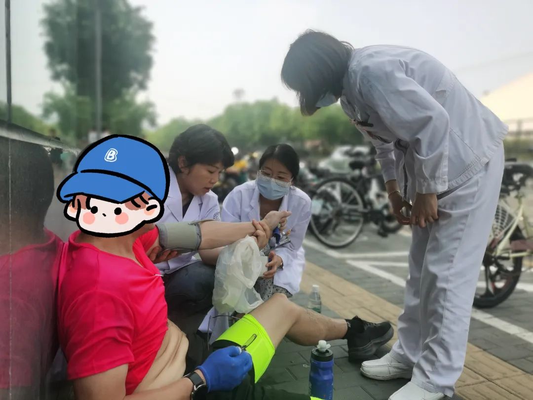 该跑者阿元先生因突发身体不适,全身无力、大汗淋漓晕坐在地铁口附近,面部还伴有轻微擦伤。急救小组协同配合,紧张有序地开展身体检查和测量血压、血糖,为有效缓解阿元的急性呼吸性碱中毒状况,医护人员利用急救知识,智慧地现场取材制作的简易面罩快速缓解了阿元的呼吸困难。