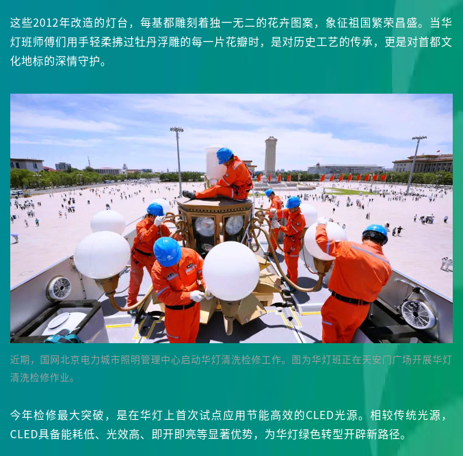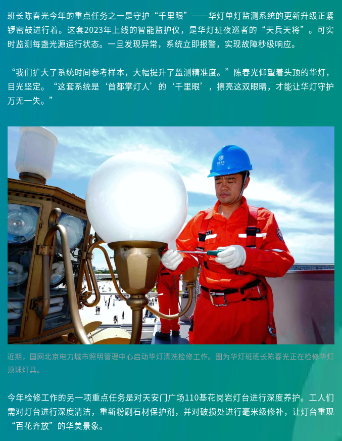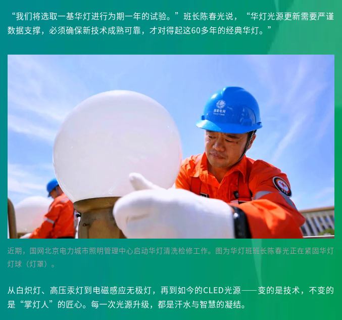 华灯璀璨如新,因有人愿做暗处的守护者。正是这些“掌灯人”在酷暑中攀爬的身影,让每一盏灯都成为首都夜空中最庄严的星辰。灯光照亮城市,他们点亮人心。