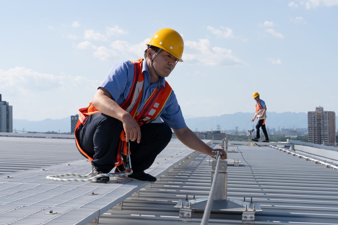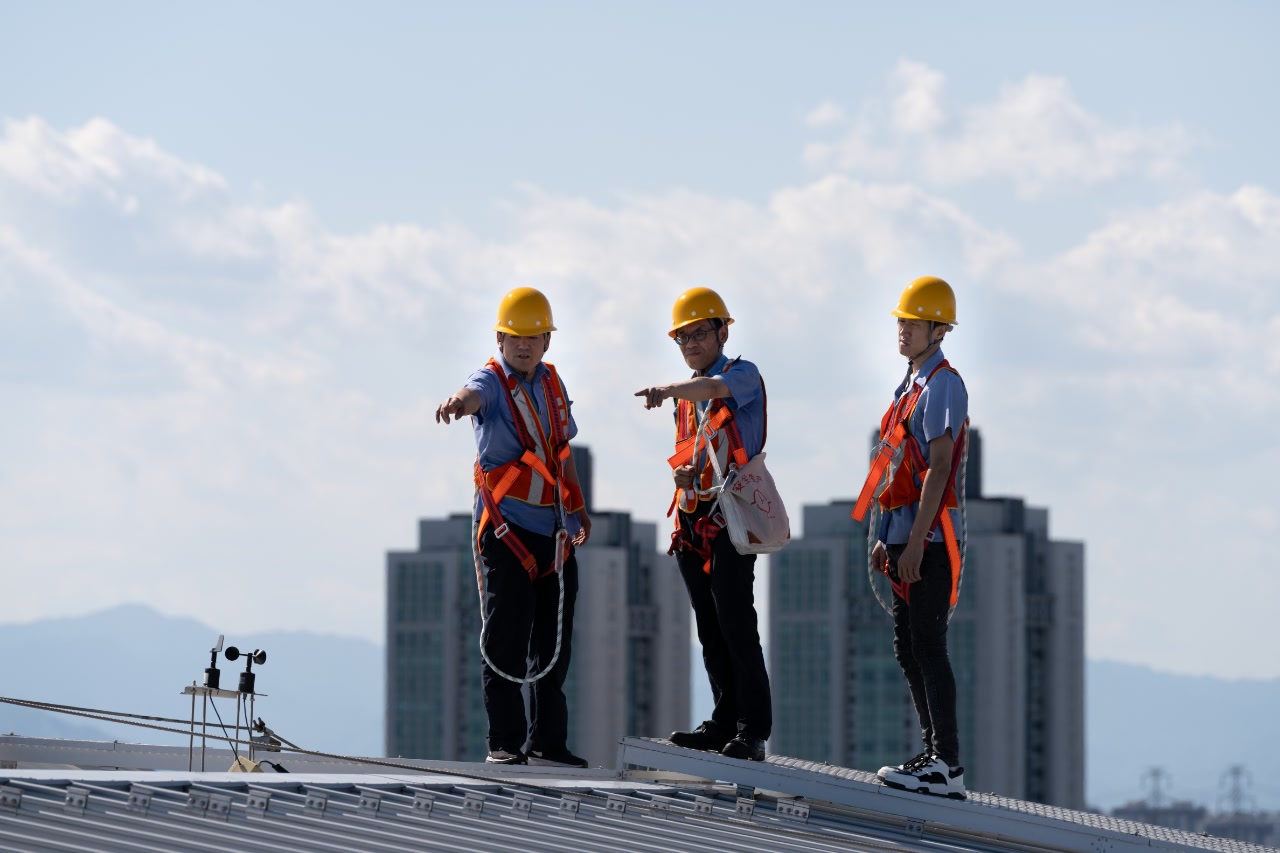 没走几步路,汗珠便顺着他们的额头淌下来,衣服也被汗水浸湿。不仅热,还晒!连偶尔吹过的微风都成了热风。脚下的铝镁锰合金屋面板材,隔着鞋底也能感觉到热。记者用测温枪一测,70.7℃!即便如此,杨晋贵和同事们还是时不时弯下腰,用手轻轻触碰发热的屋面板材、拽一拽发烫的螺丝,感受它们的紧固程度。“南数第二个采光井西侧,防风夹螺丝轻微松动,已拧紧。”杨晋贵将情况记录下来。屋顶作业,他的手机常常被晒到无法使用。