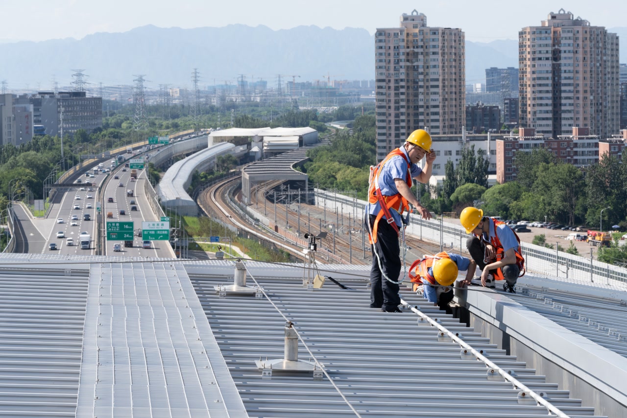 一上屋顶,蒸腾的热浪扑面而来,阳光灼人又刺眼。抬头时,杨晋贵和同事们只能眯着眼睛。站顶四周,高楼大厦鳞次栉比,复兴号列车沿着铁轨进出站,城市马路车水马龙——虽然景色十分优美,杨晋贵和同事们却无暇欣赏,他们沿着约500米长的马道走走停停,眼睛紧盯着防风夹、采光井、排烟窗等容易出现隐患的部位。