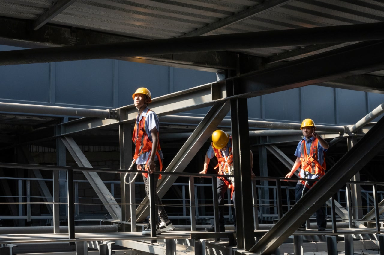 爬上房顶前,先要钻到闷热的夹层里,这里有纵横交错的钢梁和支架。杨晋贵忍着燥热检查钢结构开裂、锈蚀情况。相当于上屋顶前,他还蒸过一回“桑拿”。