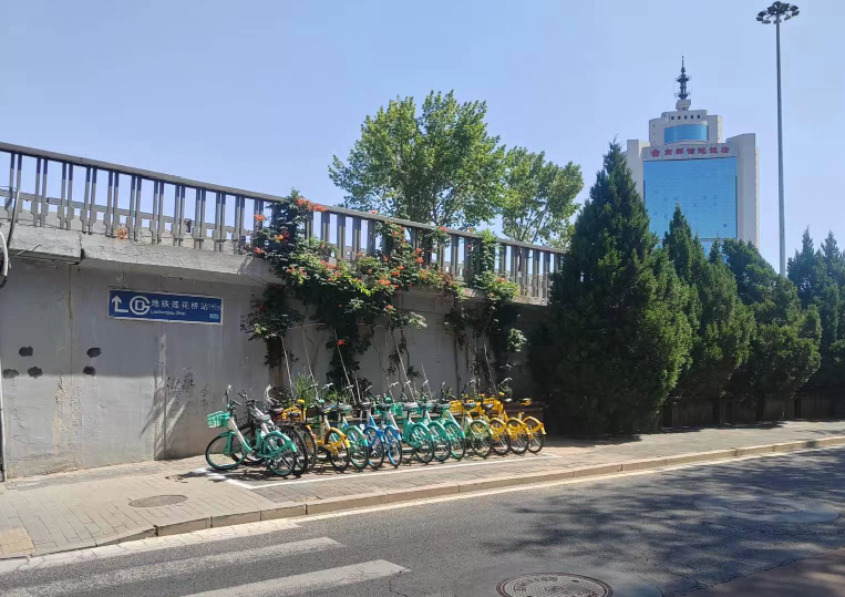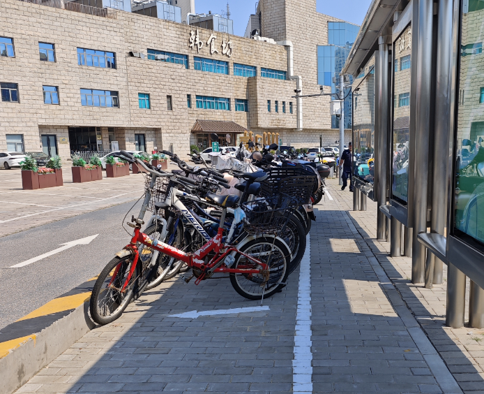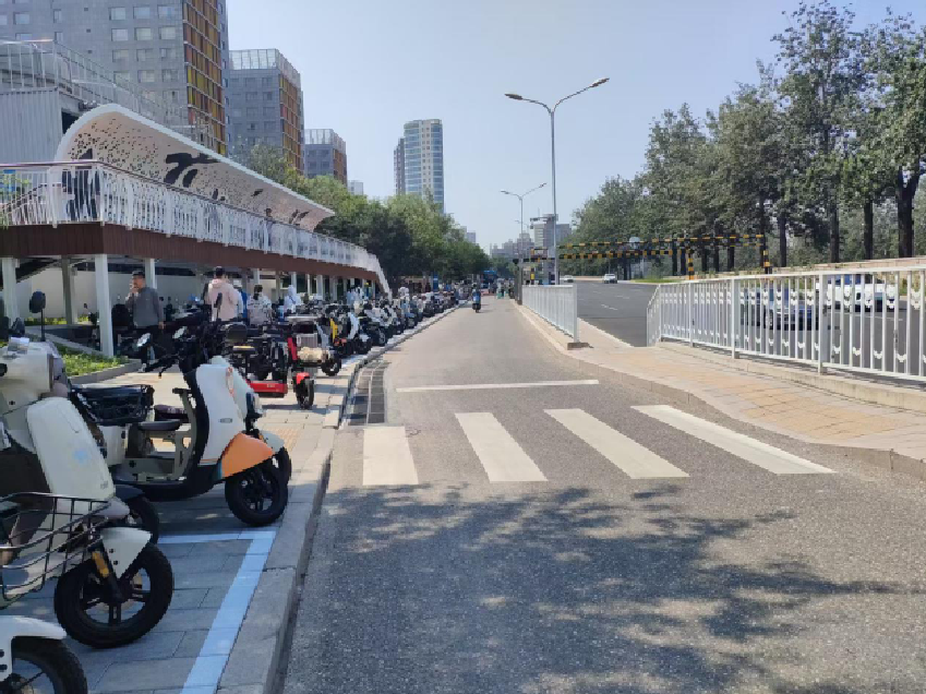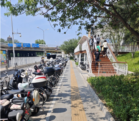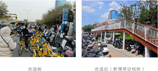 各区结合站点实际创新破题,涌现出一批特色案例。海淀区西钓鱼台站采用“空中分流+地面停放”模式和“桥-站-路”一体化空间复用策略,通过增设一处架空栈桥实现上下行客流分离,同时利用栈桥桥下空间新增40个非机动车车位。