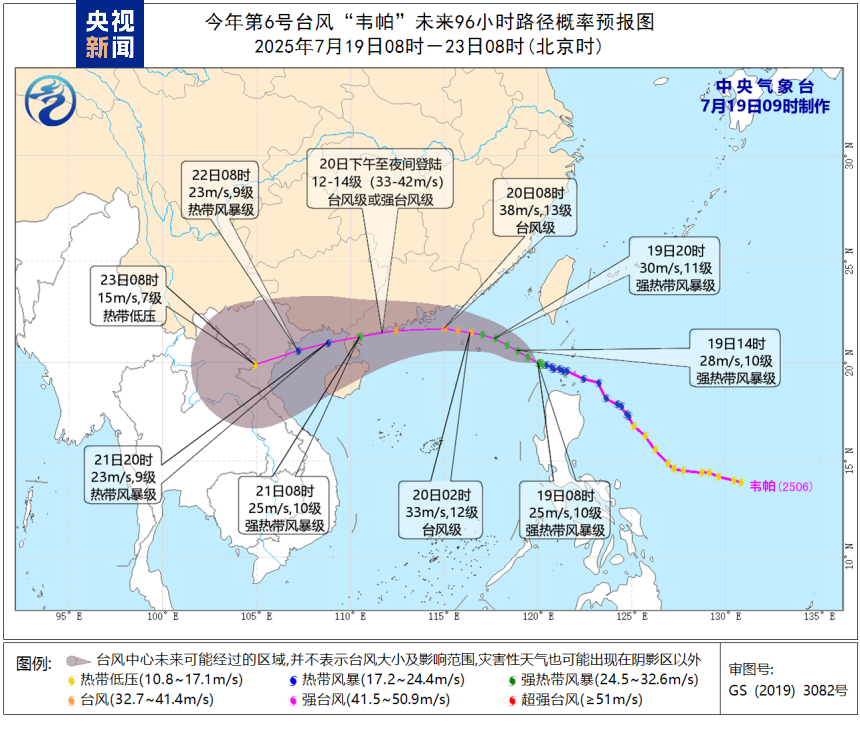 深圳市气象台2025年7月19日11时55分发布消息,今年第6号台风“韦帕”(强热带风暴级)已进入南海,11时其中心位于距离深圳东南方650公里的海面上,中心附近最大风力10级(28米/秒)。