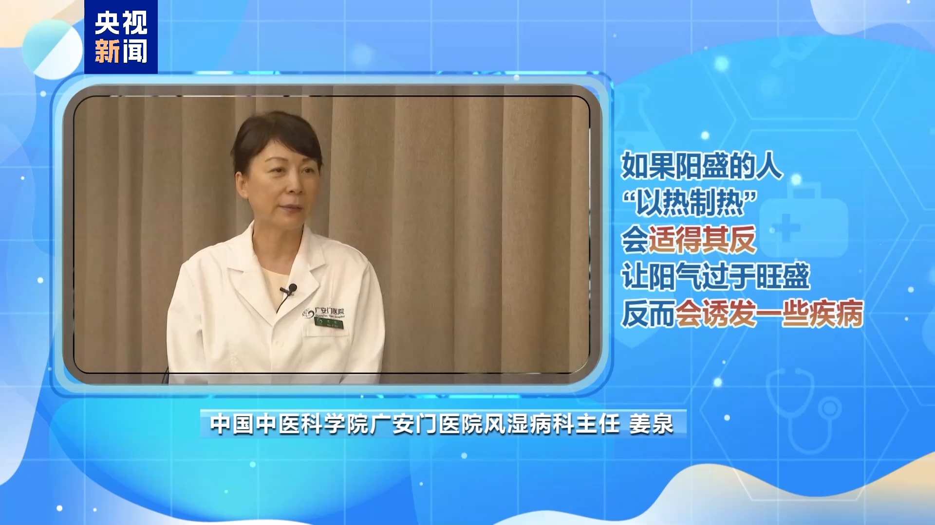 中国中医科学院广安门医院风湿病科主任 姜泉:这个应该是不完全对的。“以热治热”更适合一些我们中医认为的偏寒证这样的患者或者偏阳气虚的患者。比如晒背、喝羊汤,通过这种温阳的疗法能改善你的一些的病症,这是非常好的。但是还有一部分人他本身就偏热的,比如容易手脚心发热,从中医来讲更多的是阳盛的人,那么你如果“以热治热”的话,反而适得其反。阳气过于旺盛,反而会诱发一些疾病。一些免疫紊乱偏于免疫亢进的这一类的患者,他就不适合“以热制热”。