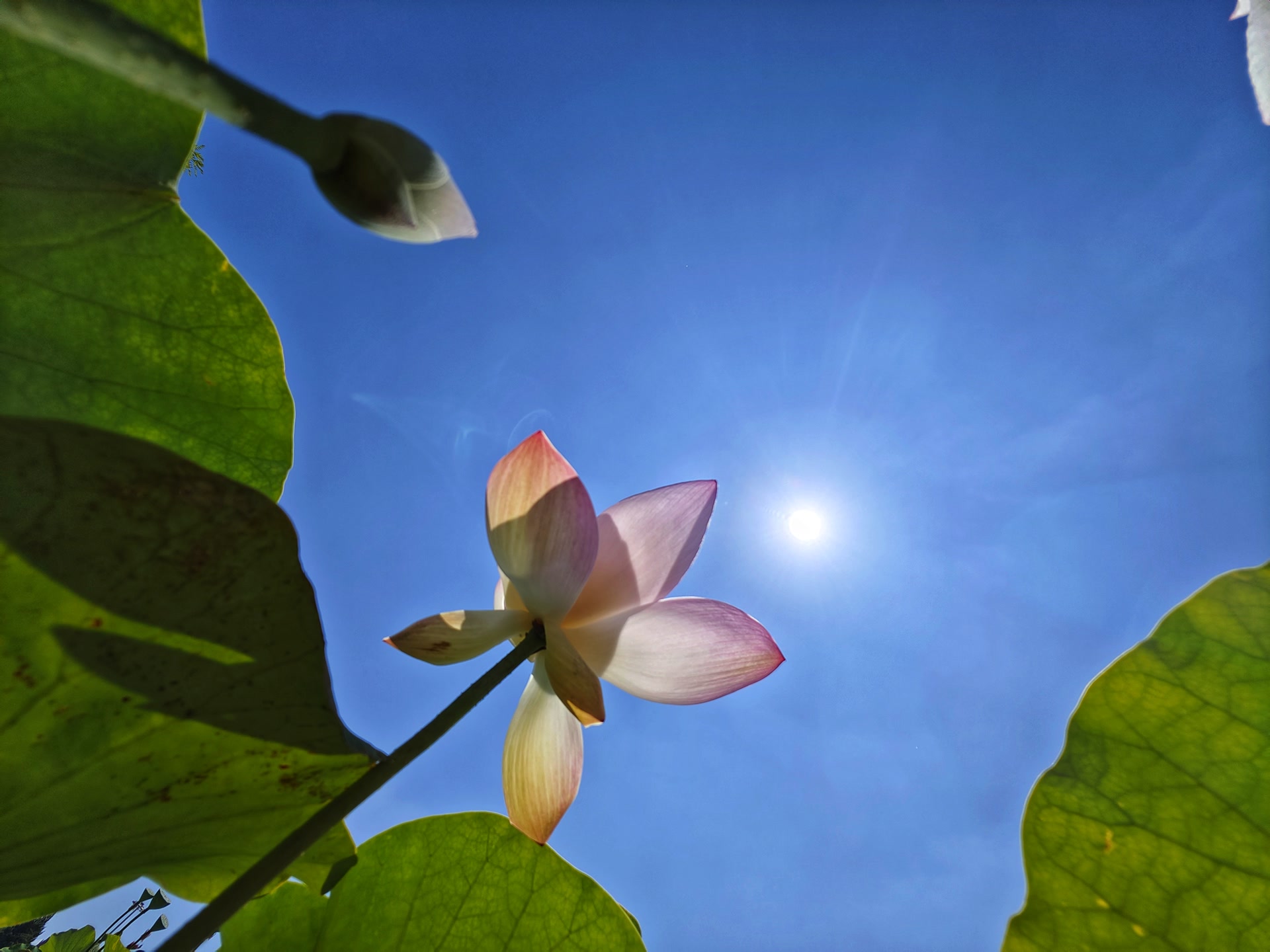 三、构图可以三分法,将荷花置于画面1/3处,留白呼应环境;也可以采用对称构图,利用水面倒影形成对称美;亦可以俯拍展现荷花与荷叶的布局关系。还可以采用低角度仰拍,贴近水面,以荷花为前景,天空为背景,营造“出淤泥而不染”的意境。