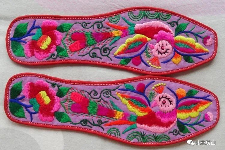 这项传统的技艺从未脱离生活,枕头上的缠枝莲纹、针线布兜里的石榴图案、孩童虎头鞋上的虎纹,都藏着生活温度。衣帽服装上的刺绣更显巧思,妇女斜襟布衫的领口袖口缀着缠枝纹,老人寿衣上绣着松鹤延年纹样,在朴素布料上勾勒出独属宝水村的审美韵味。