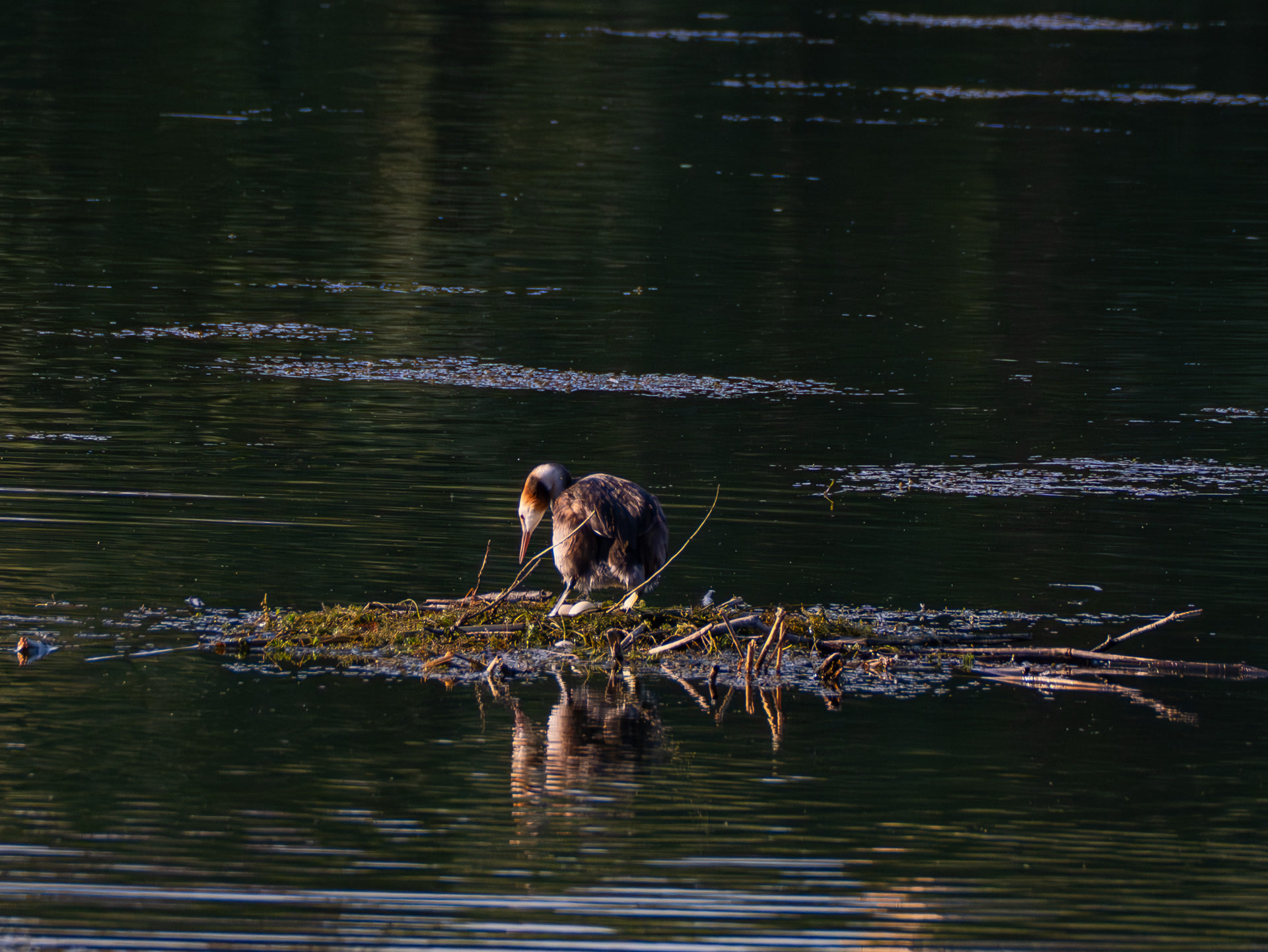 在朝阳区水务局马家湾段船工师傅的协助下,居民们把人工浮巢放在了原先营巢的位置。一天、两天,都没有动静,15日,失巢的凤头䴙䴘夫妇终于来了,它们又恢复了精气神儿,一点点衔来树枝和草,把新家垫得软和舒适。7月21日早上,它们终于在新家中诞下了两枚蛋。