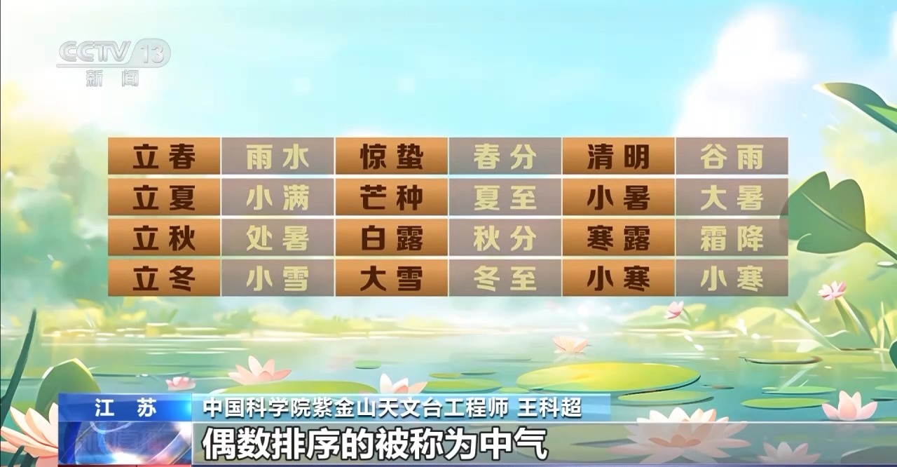中国科学院紫金山天文台工程师 王科超:二十四节气是“置闰”的一个重要规则依据。从立春开始,偶数排序的被称为中气,像夏至、大暑和处暑都是中气。其中包含大暑的农历月为六月,而包含处暑的农历月为七月,但是在今年的农历当中,农历六月之后的农历月,它只包含了立秋这一个节气,而不包含处暑,所以六月之后的月份被称为闰六月,而包含处暑的农历月才被称为七月。