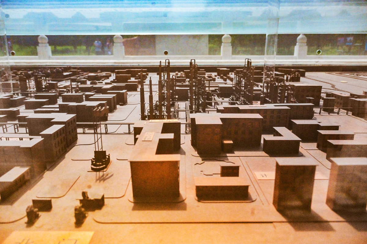 东方化工厂遗址被改造成为公园星型园路上的热门景点。在北京大运河博物馆的东南方向,紧邻运河故道的林木草滩中,矗立着两尊雄壮威武的麒麟雕塑,见证着这片土地上的历史变迁,麒麟身后就是曾经东方化工厂的厂牌和传达室,依然保留着当年的建筑风格。宽阔的旗杆广场上,立着一块“向东方化工厂建设者致敬”的汉白玉石碑,虽然石碑已略显斑驳,但字迹仍清晰可见,记载了在一片荒滩上从无到有的建厂壮举,向前来参观的游客讲述着“东方”建设者顽强拼搏的“东方”精神。广场四周,工业管道串联起一块块图文并茂的展板,展示了从东方化工厂到城市绿心森林公园的历史沿革以及周边工业遗址的改造情况。广场中间的铜制沙盘上,精致的模型生动再现了老厂区的每一处空间布局。老“东方人”张先生告诉记者:“老厂区拆的时候还挺不舍的,但改造之后的公园环境还真不错,你看这个工业遗址展,也为我们老员工留了个念想。”