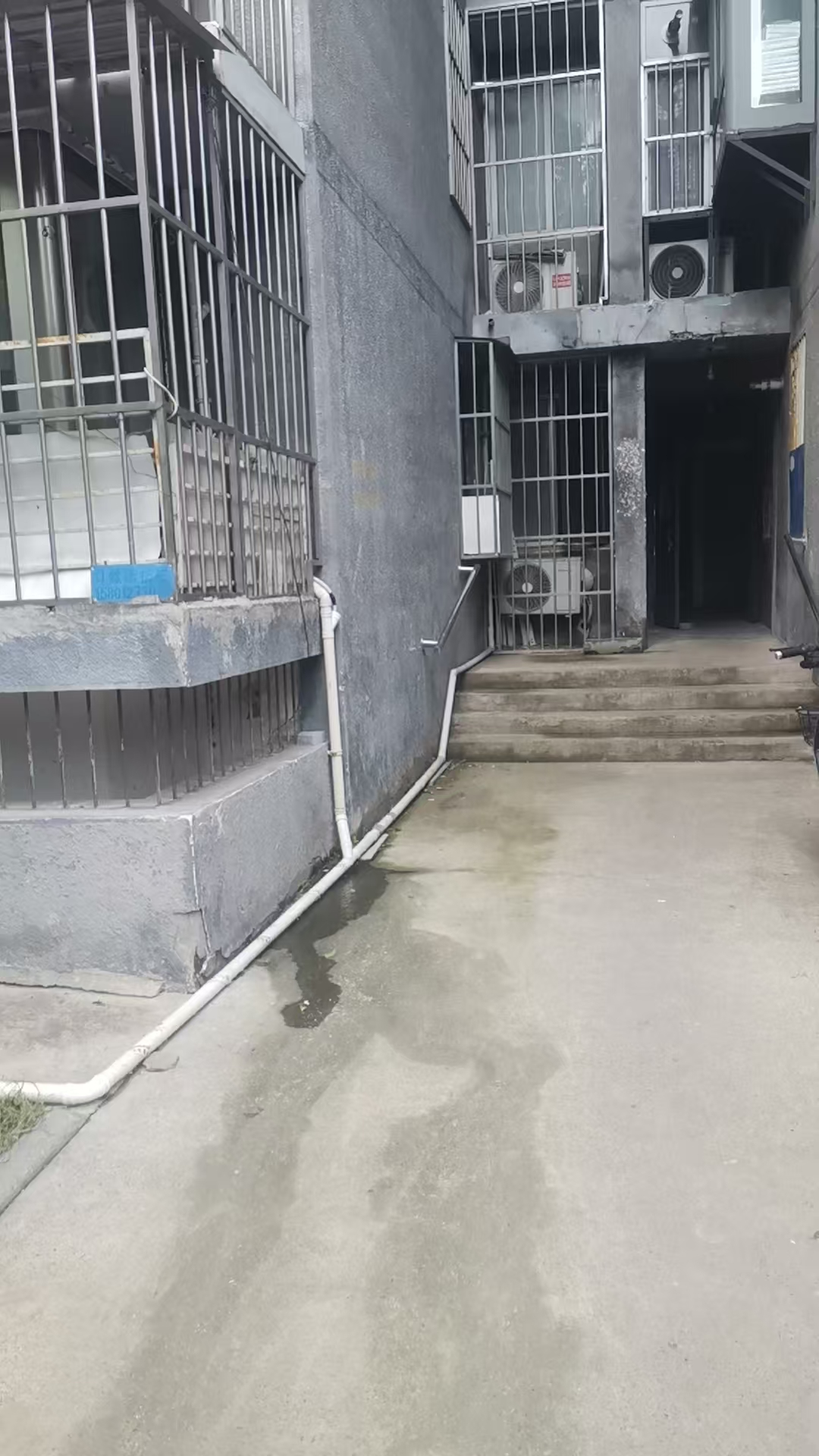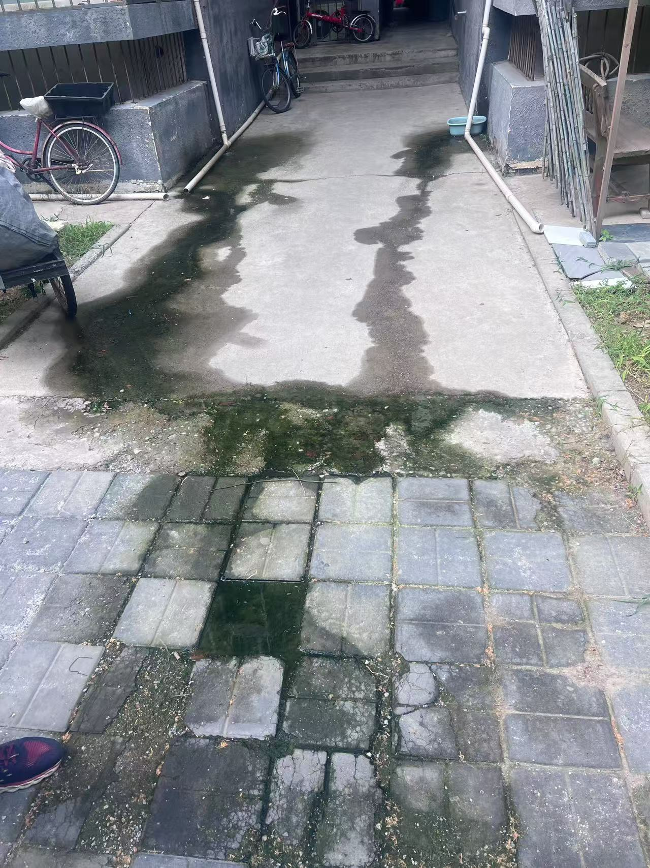 接到诉求后,社区工作人员立即联系物业,并一起到现场查看。经过仔细检查,大家判断是107号楼楼体排水管出现了漏点,致使排水不畅,导致积水渗出到楼门口地面;因设计原因,107号楼楼门口缺乏直射阳光,地面老旧砖石残留垃圾,分解后形成腐殖质,为青苔提供了养分。