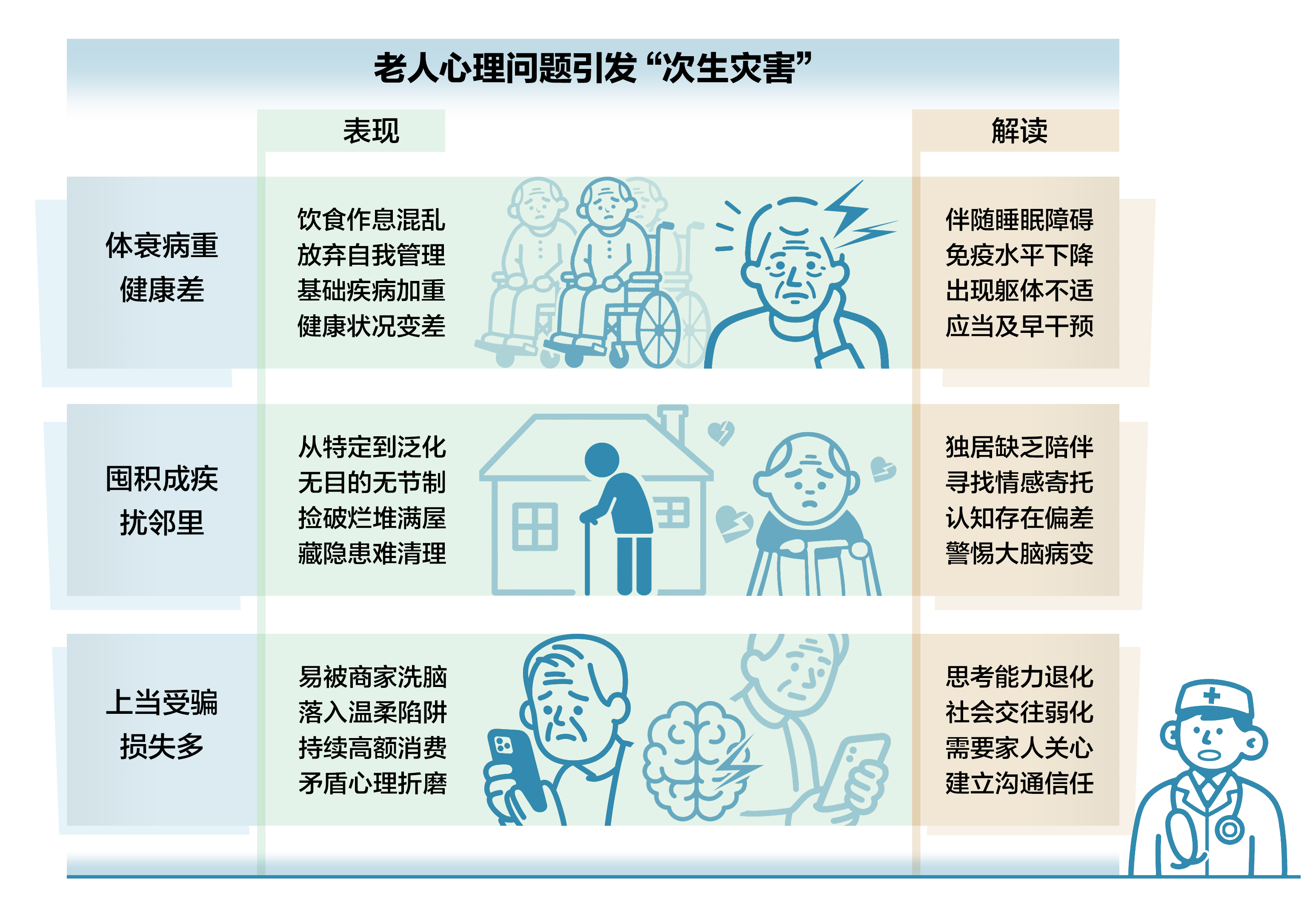 老人一旦出现心理问题,往往会带来诸多潜在危害。在心理问题的影响下,老人的身体可能一点点被拖垮,健康状况堪忧。此外,还可能出现过度囤积等失常行为,给自己和他人带来困扰。更有甚者,心理问题会让老人更容易上当受骗,导致身心和财产遭受多重打击。