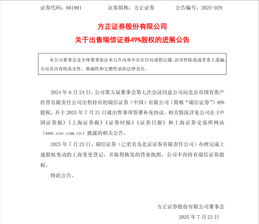 7月23日晚,方正证券发布出售瑞信证券49%股权的进展公告称,瑞信证券当日办理完成上述股权变动的工商变更登记,并取得换发的营业执照,公司不再持有瑞信证券股权。