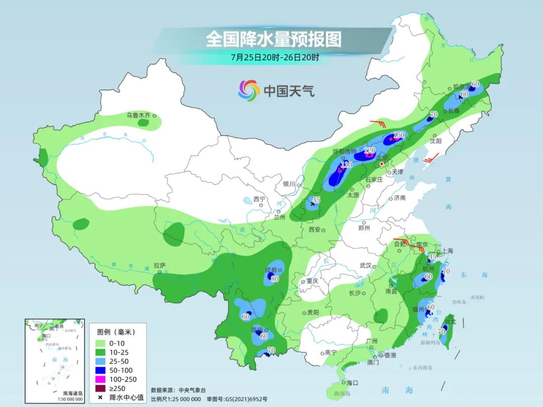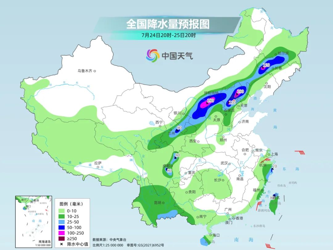 明后天,北方的强降雨仍会持续,局地雨势猛烈。中央气象台预计,今天夜间至26日,西北地区东部、内蒙古中西部偏南地区、华北中北部、东北地区等地有持续性强降雨,上述部分地区有大到暴雨,局地大暴雨;部分地区伴有短时强降水、雷雨大风或冰雹等强对流天气。中央气象台今晚18时继续发布暴雨黄色预警。