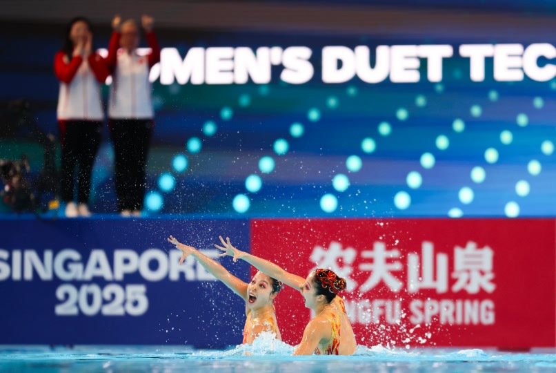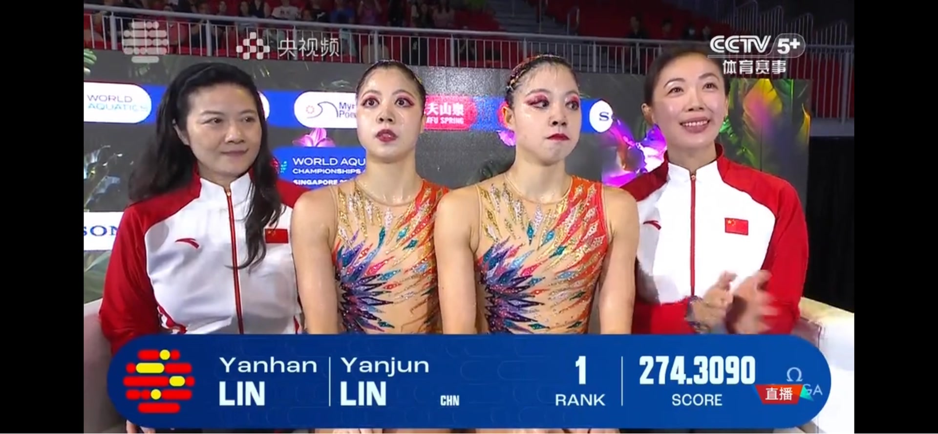 7月24日晚,2025年新加坡游泳世锦赛花游女双自由自选决赛进行。来自北京队的双胞胎组合林彦君/林彦含获得第四名。