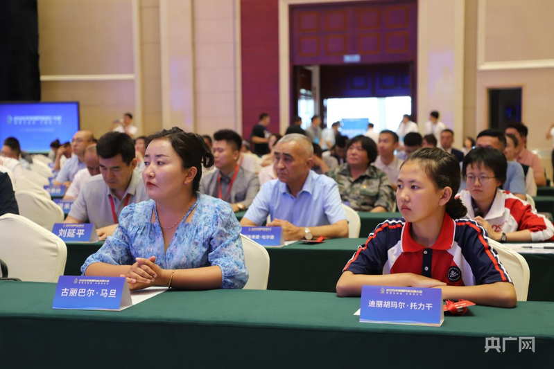 迪丽胡玛尔·托力干(右一)在2025年新疆网络文明大会现场 (央广网记者丁安 摄)